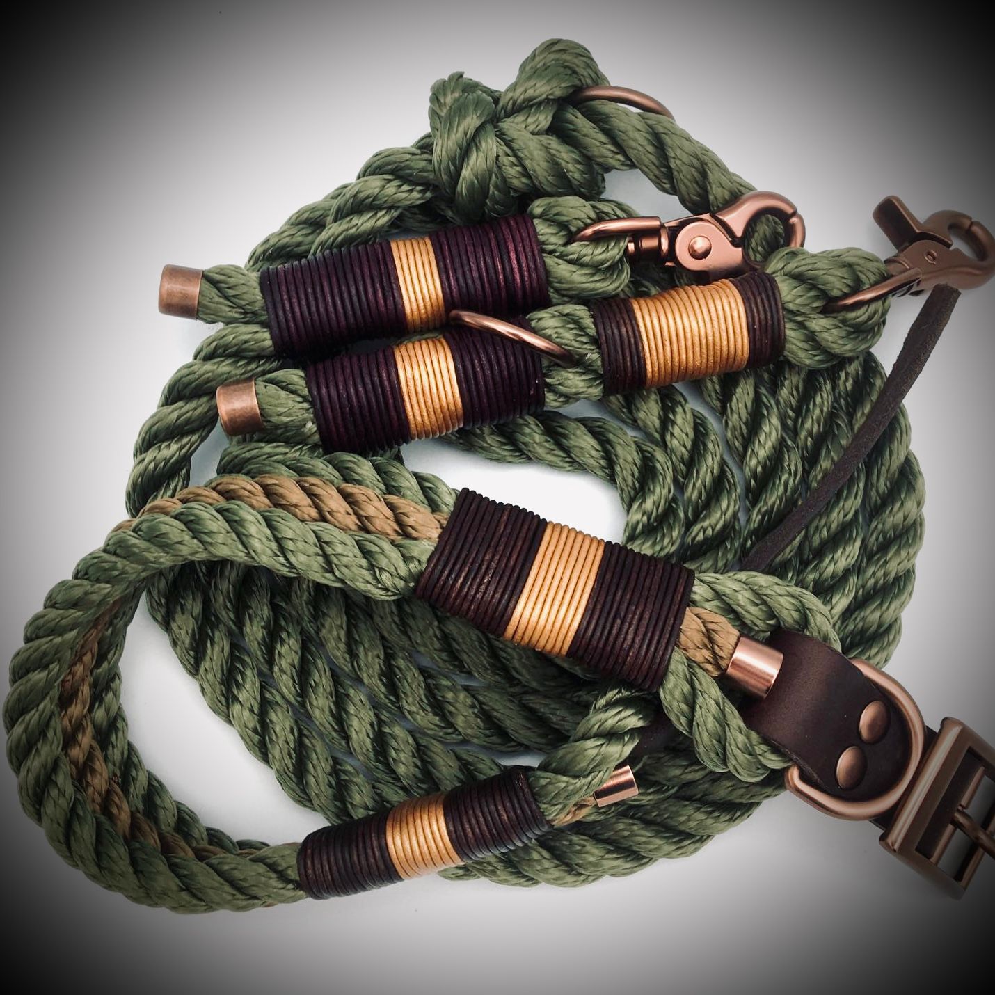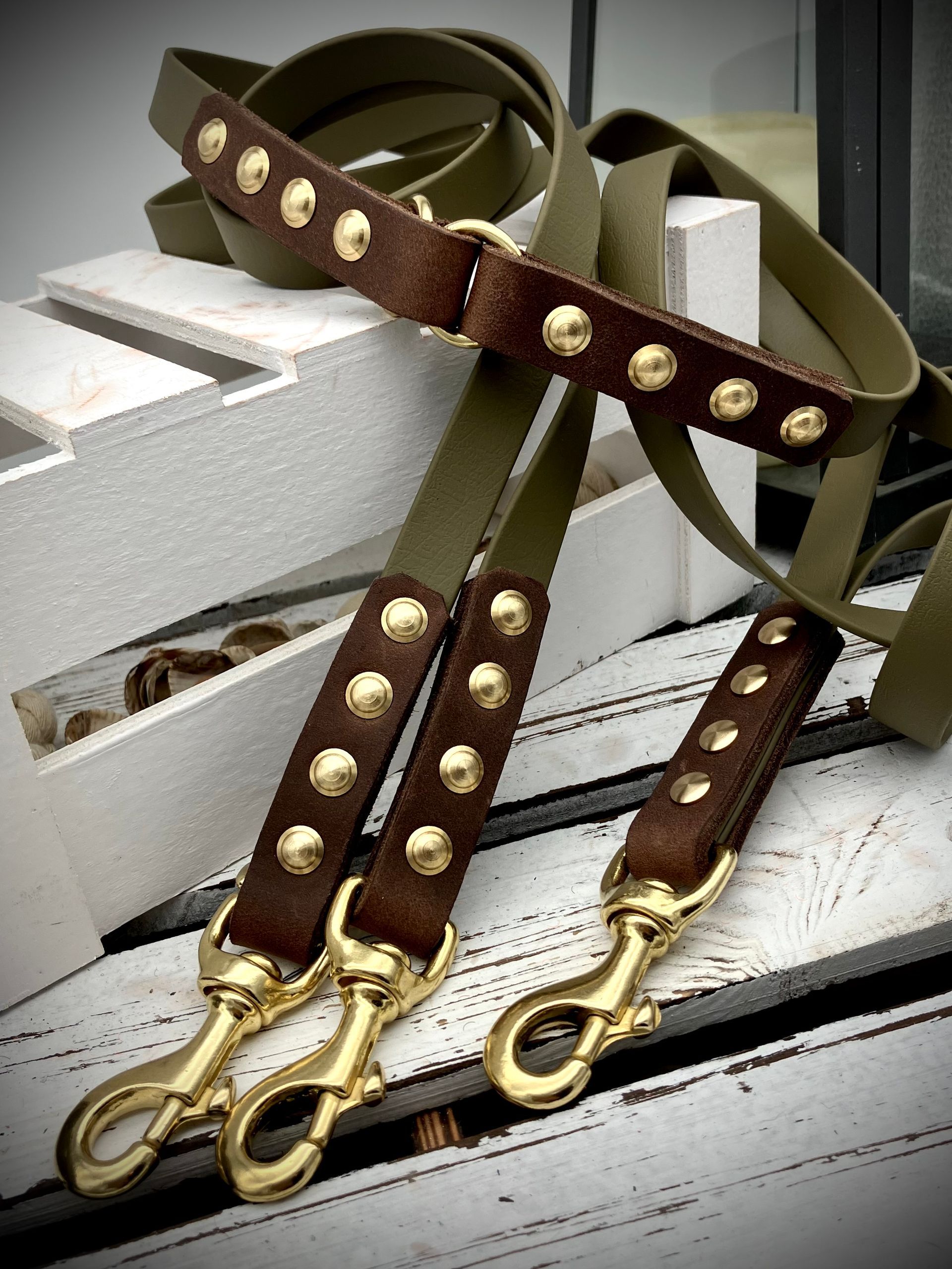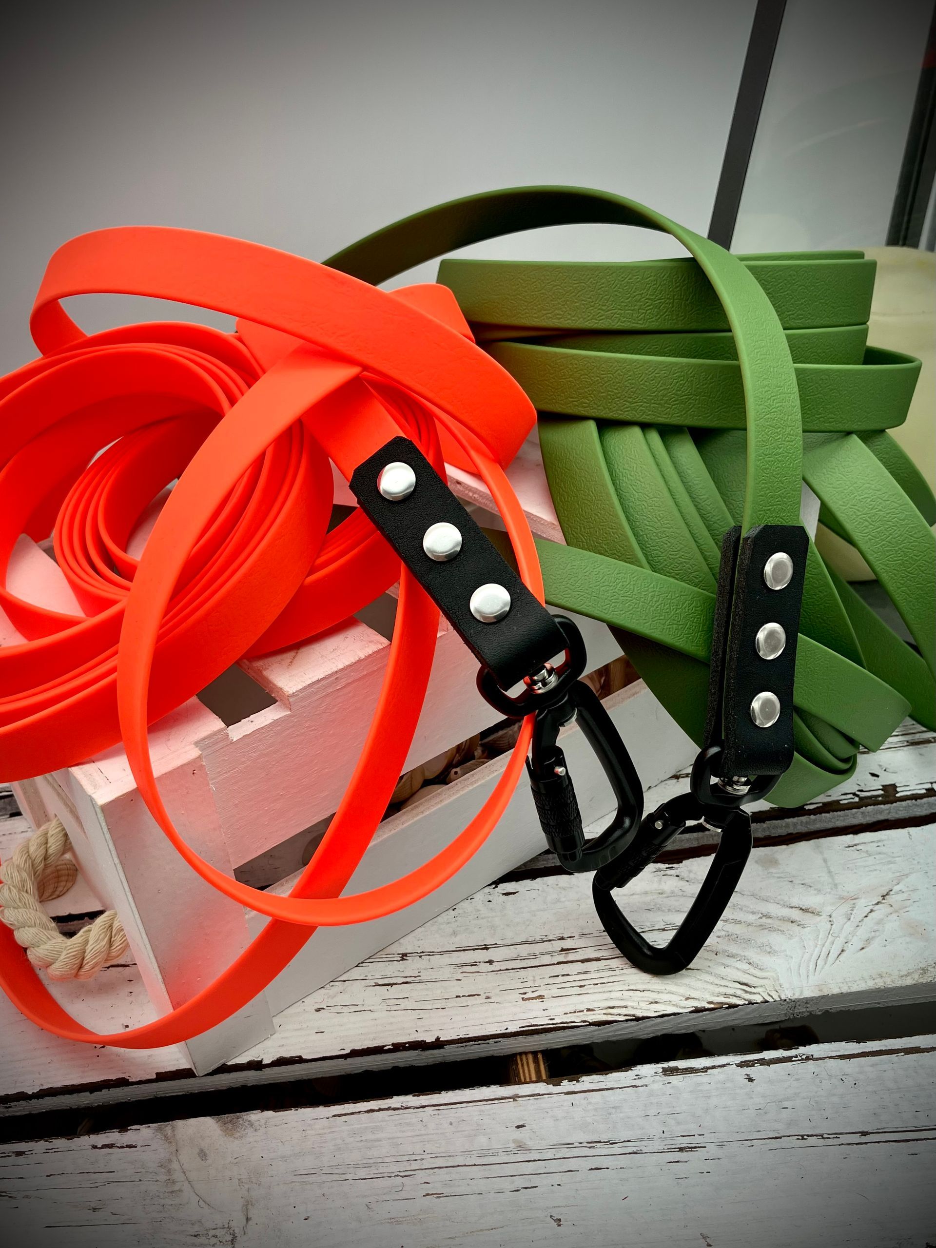 Die Leinen werden von mir auf die gewünschte Länge angefertigt. Ich persönlich empfehle eine Länge von ca. 2,2 Meter mit drei Ringen zum Verstellen. Durch die Ringe ist man während eines Spaziergangs flexibel.