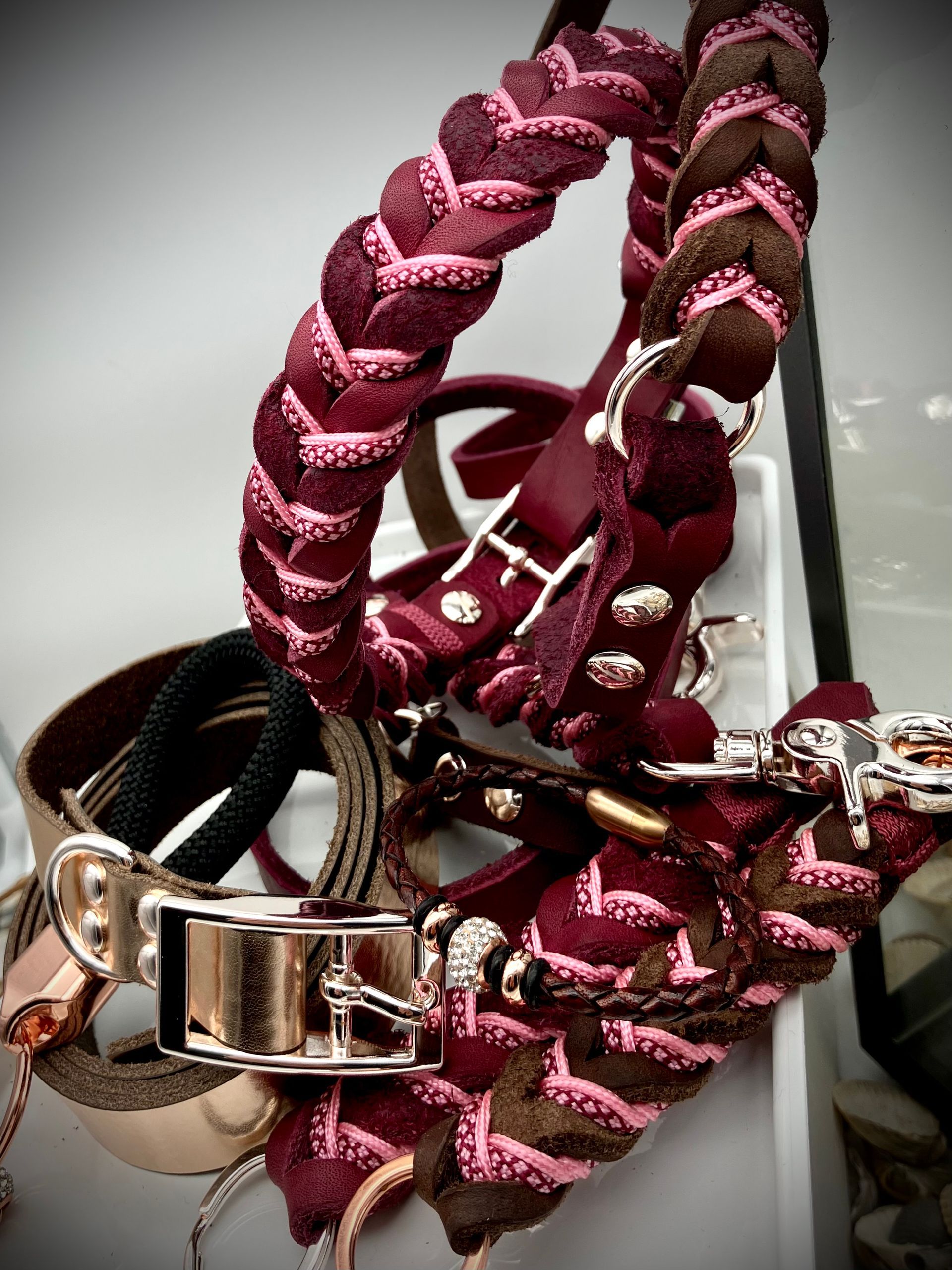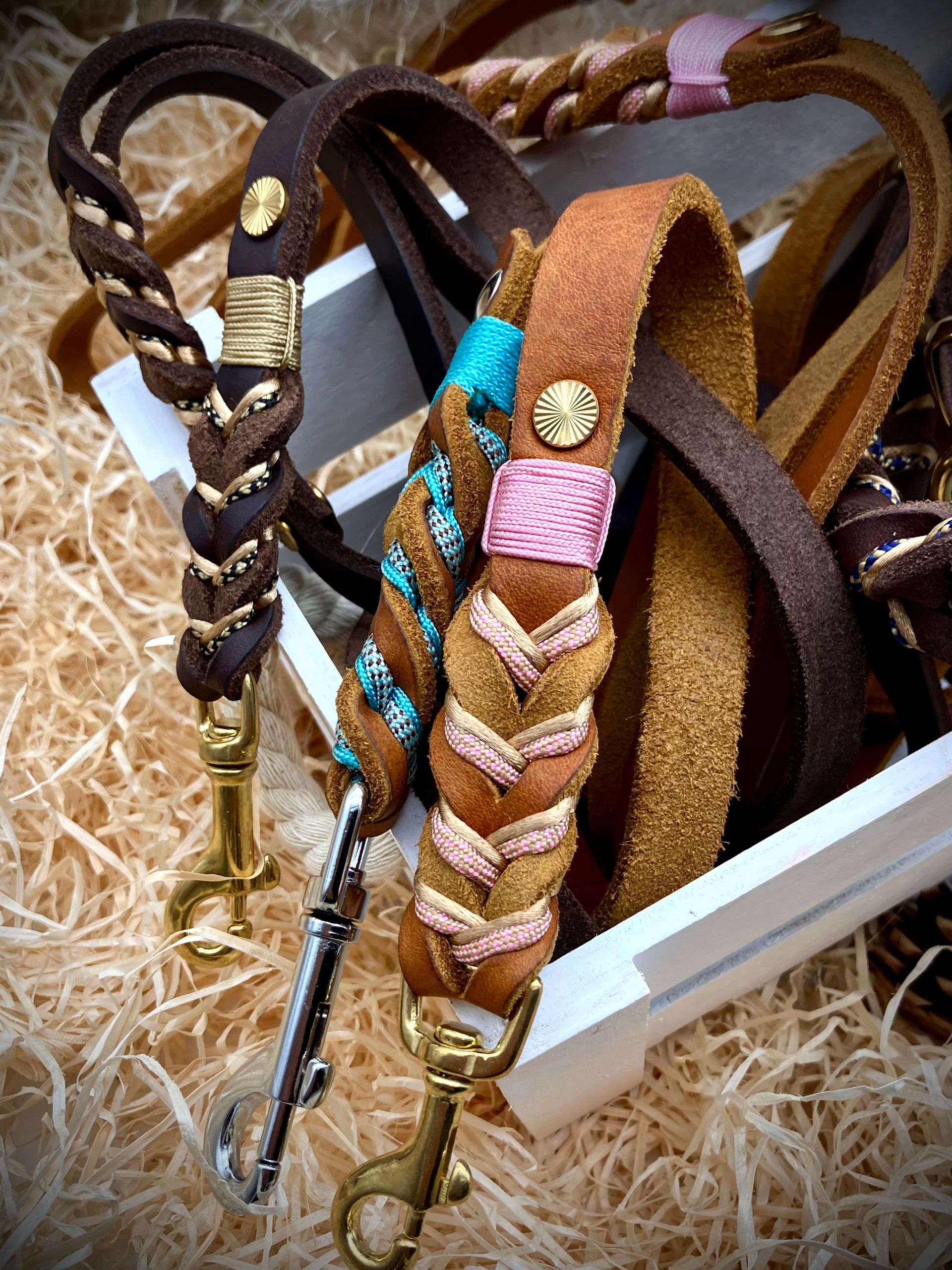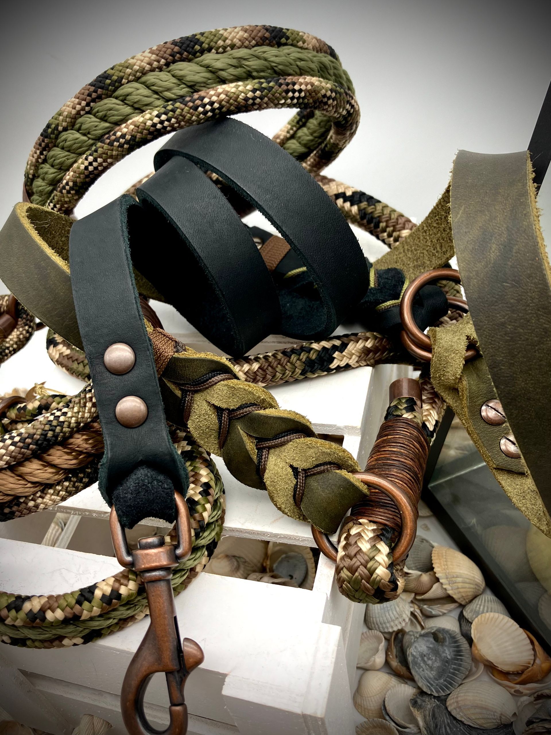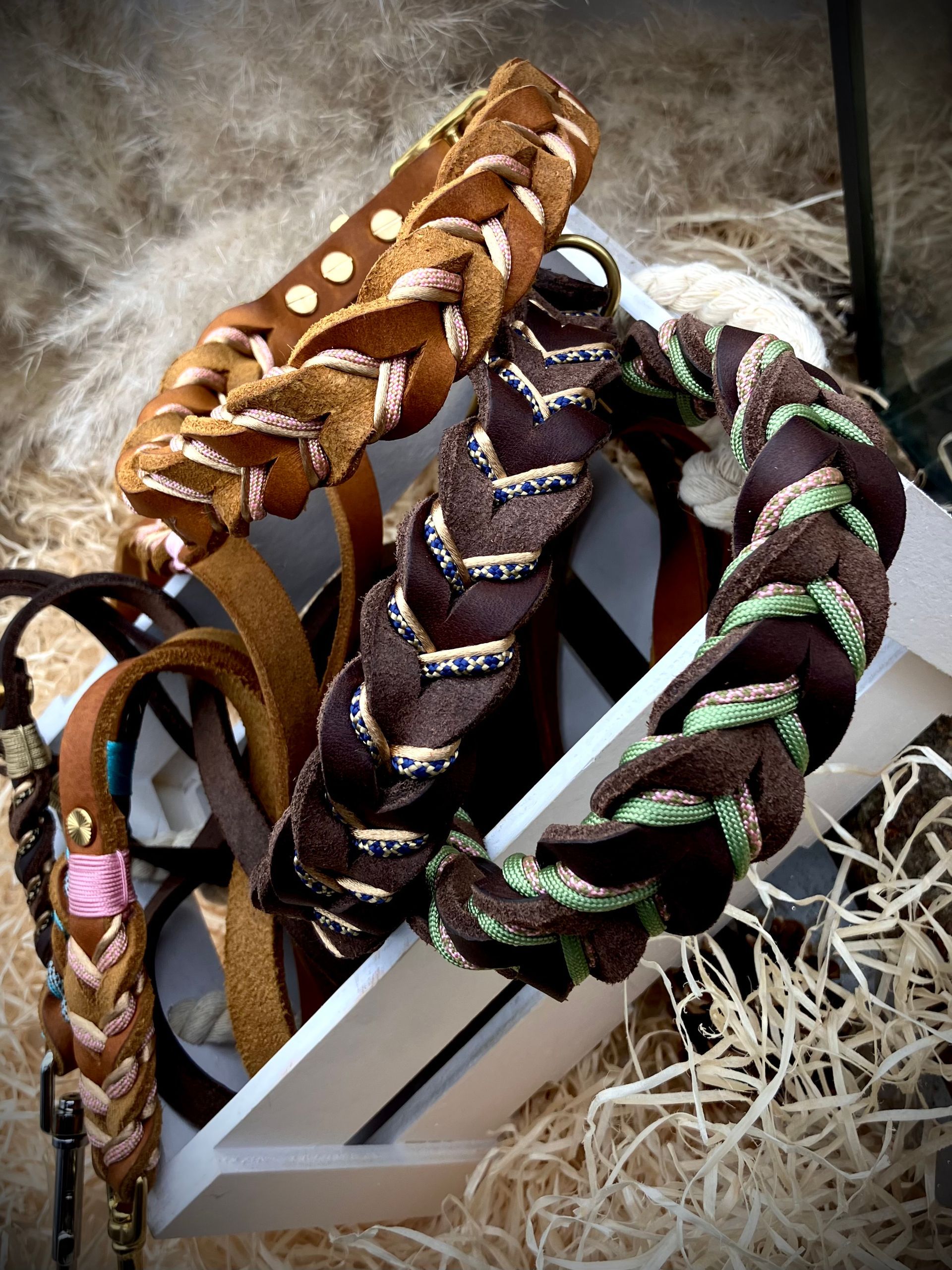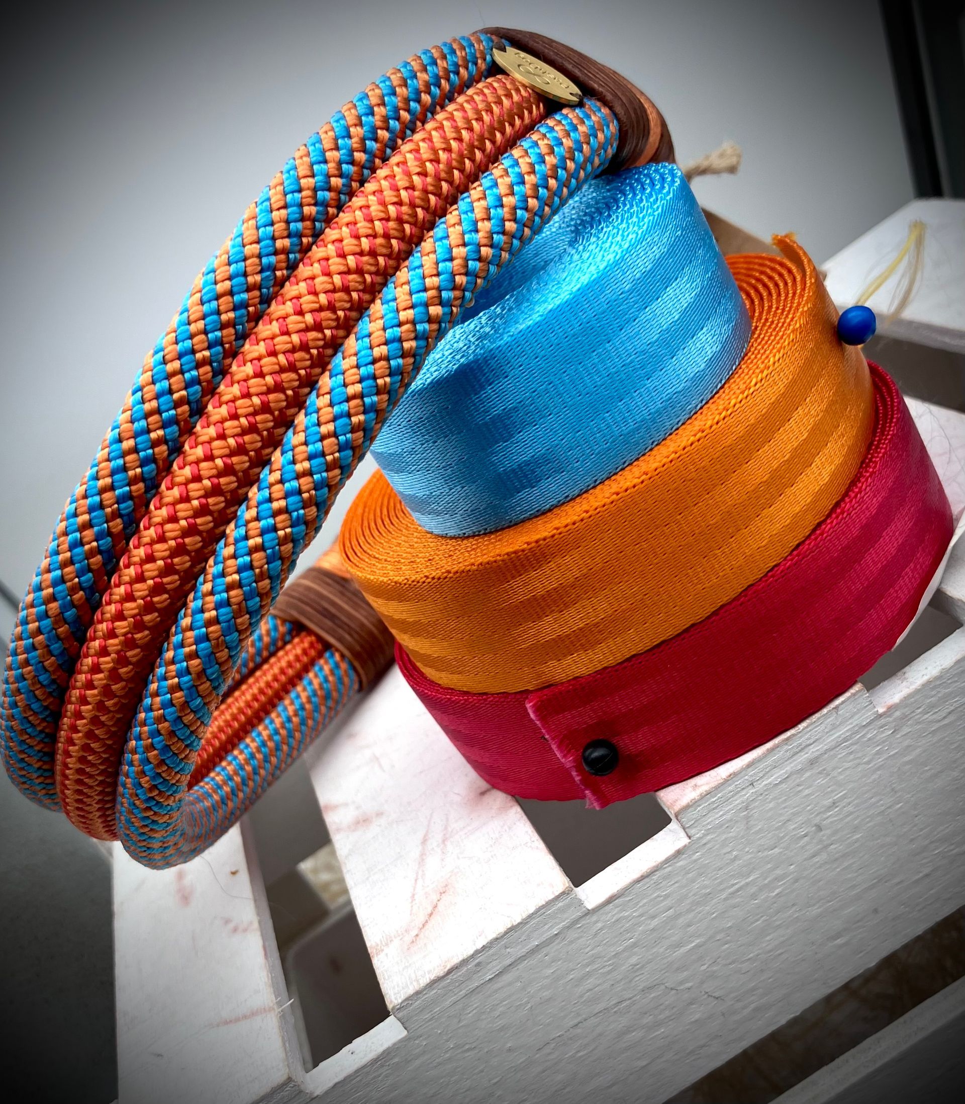 Ihr habt die Wahl: Seil (Ø 8, 10 und 12 mm), Fettleder, Gurtband mit oder ohne Borte, Beschläge. Alle Materialien stehen in vielen Farben zur Verfügung.