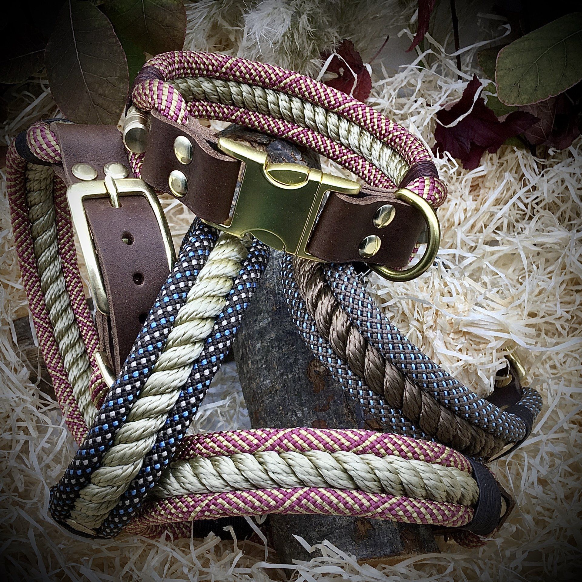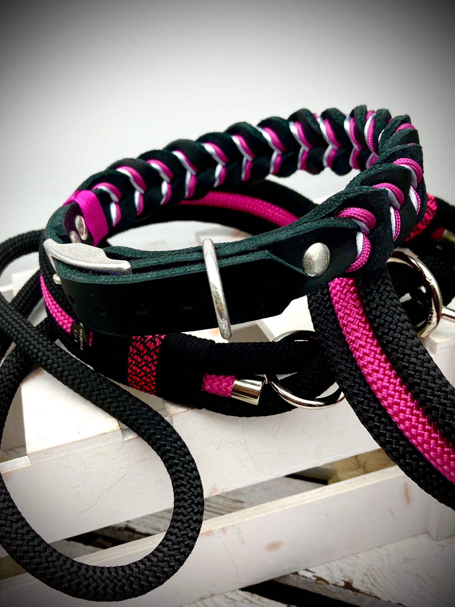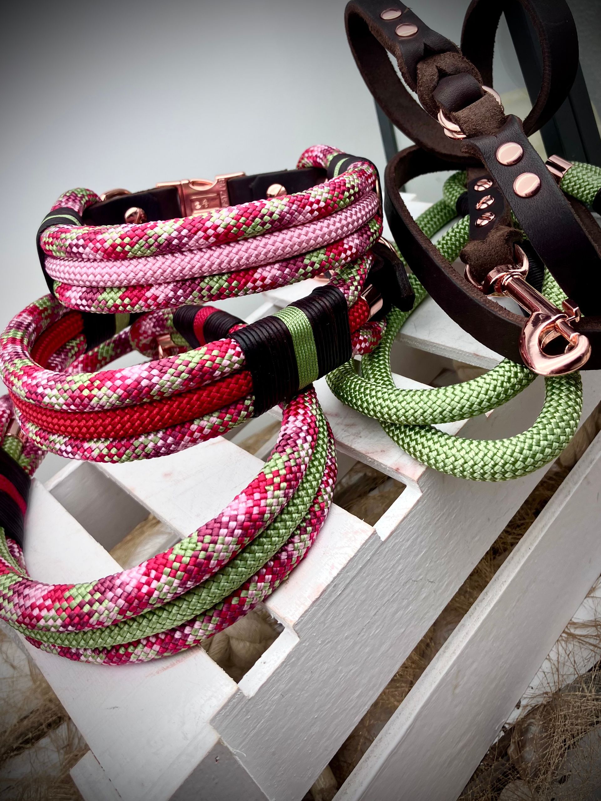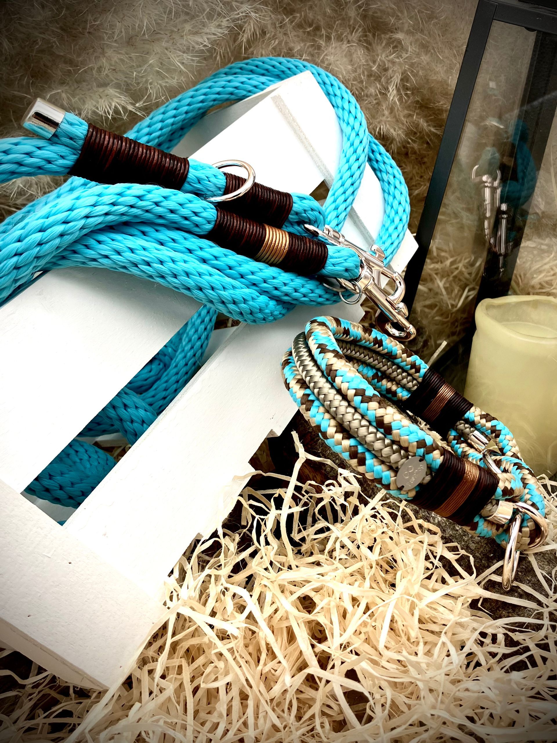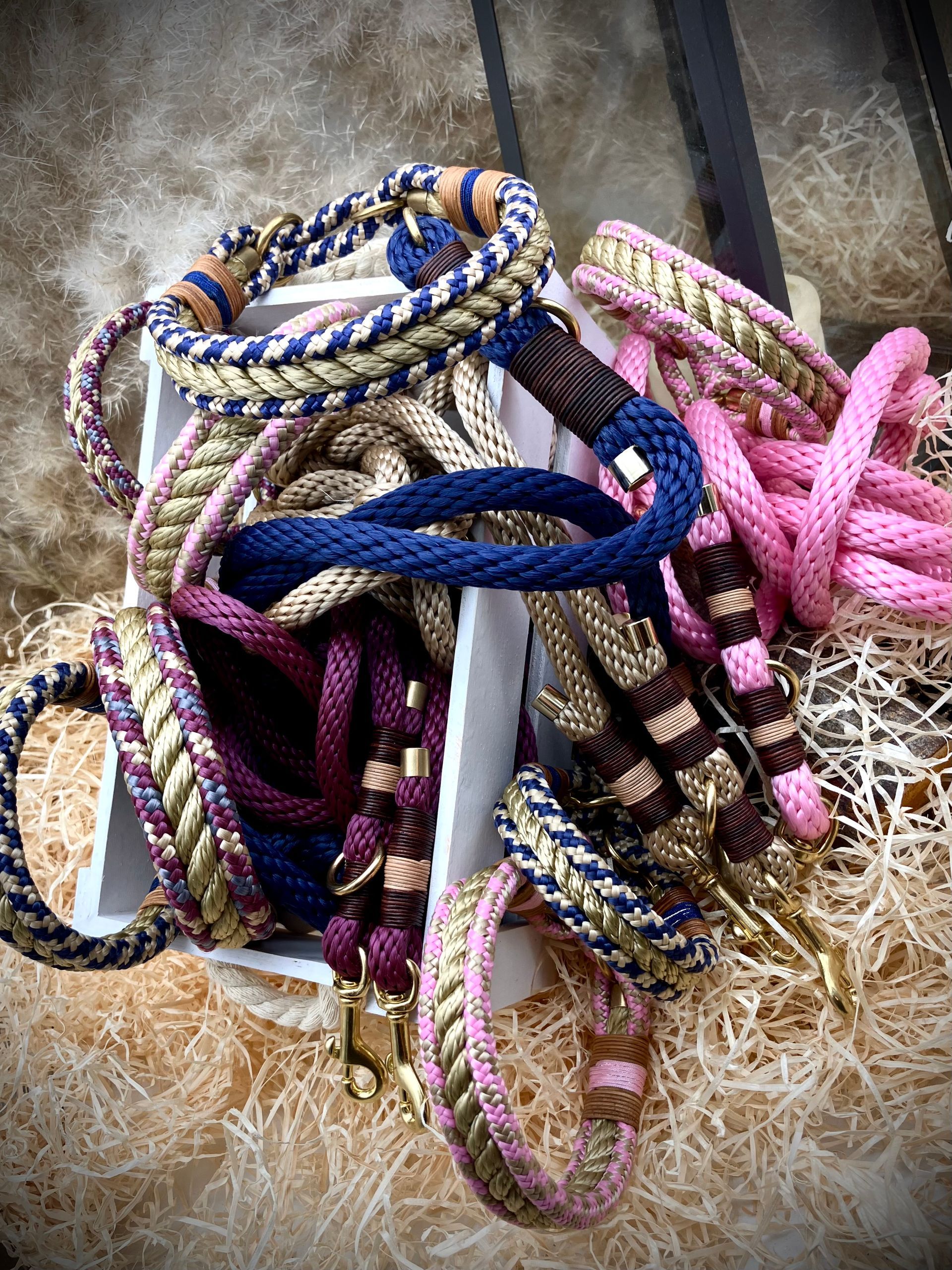Ich fertige Hundehalsbänder und Hundeleinen entweder aus PPM-Seil (Gedreht, Rundseil, Spiralgeflecht), Hundeleinen-Seil kombiniert mit Fettleder oder aus Gurtband + Polsterung an.