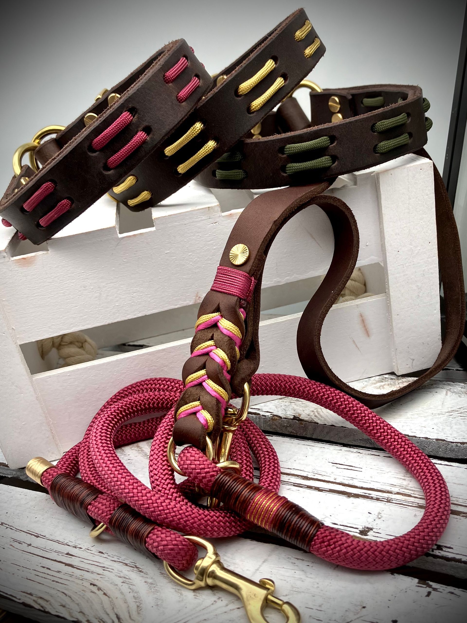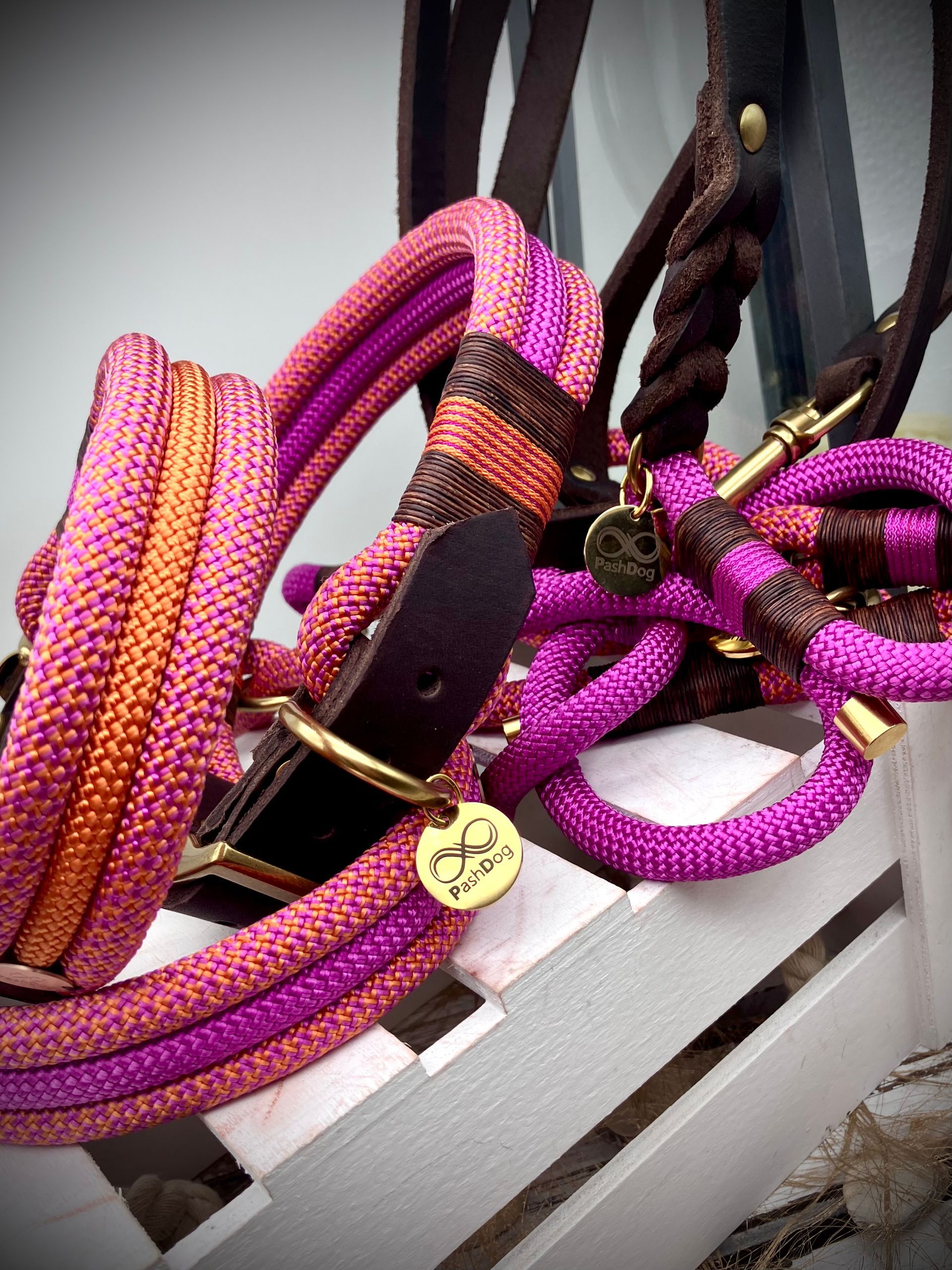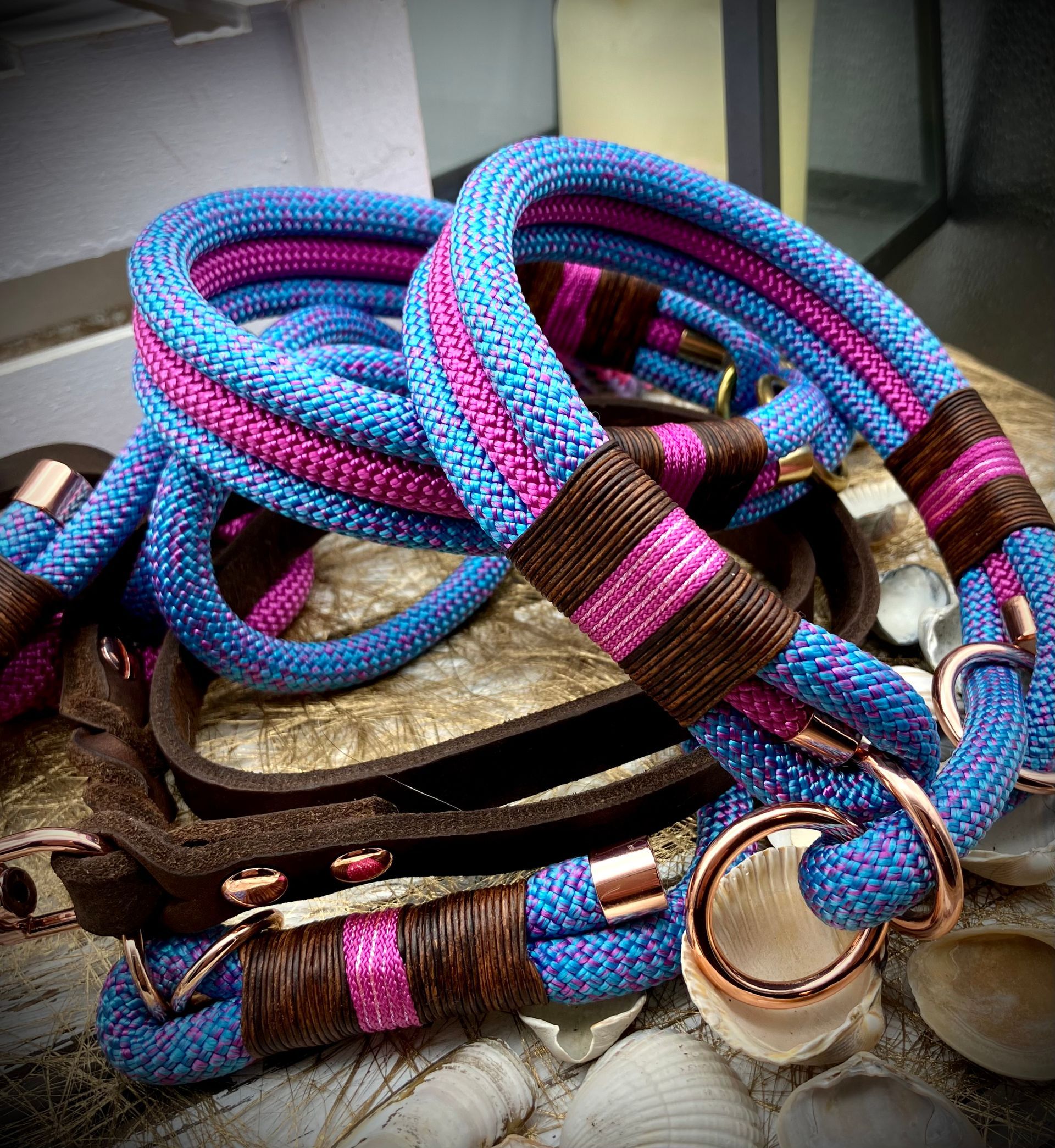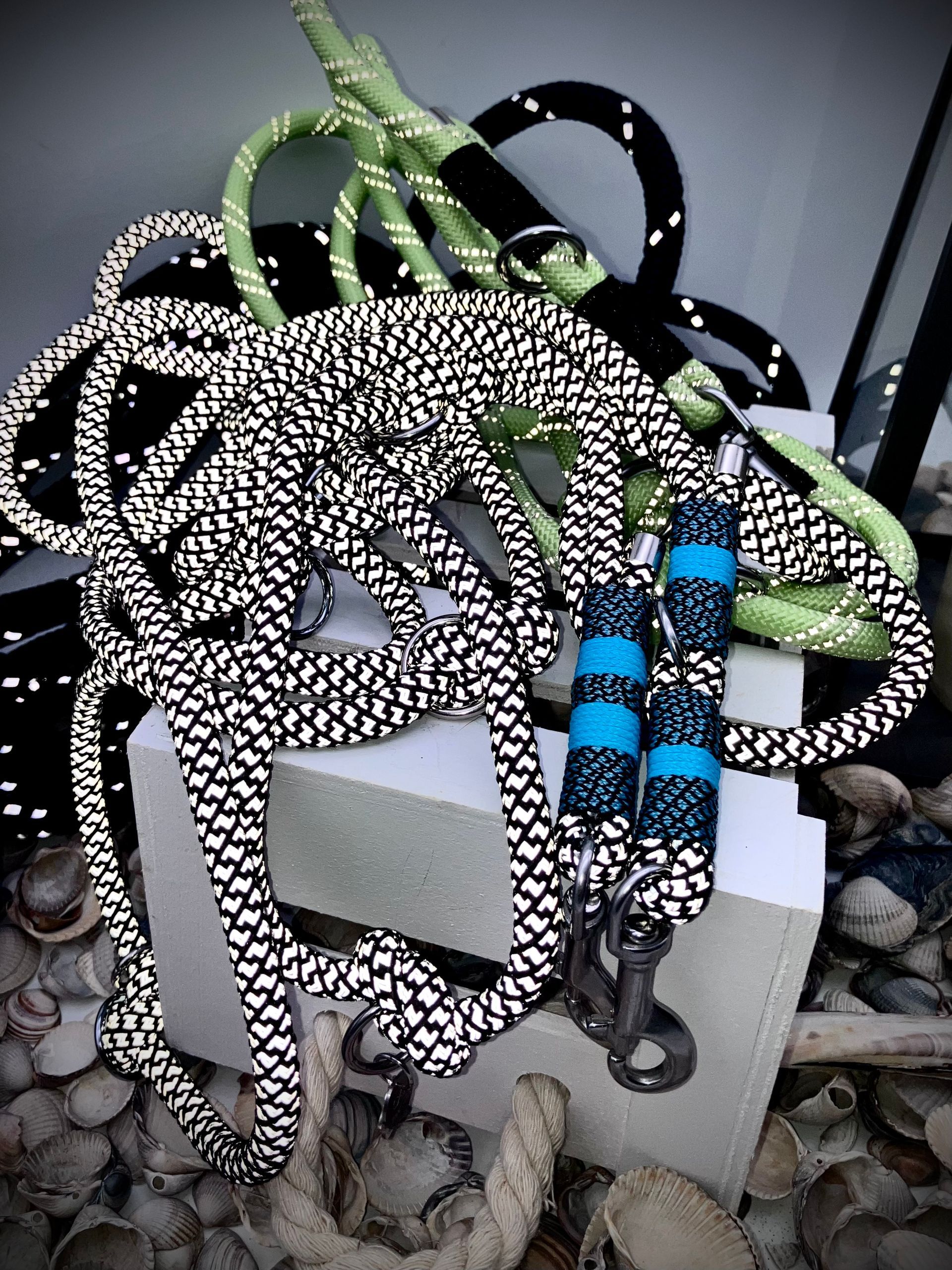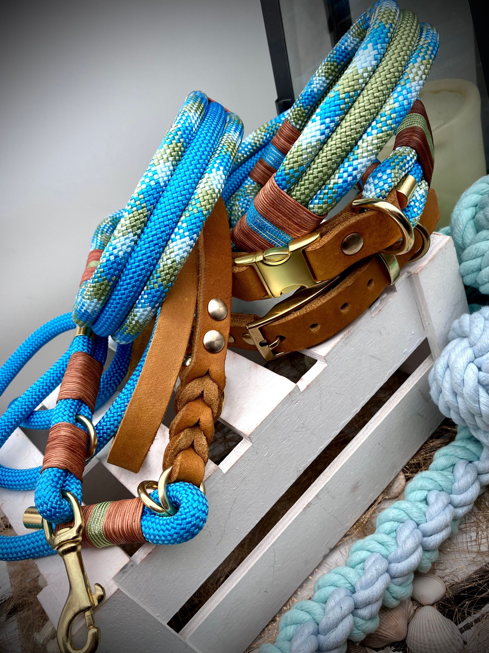 Ich fertige Hundehalsbänder und Hundeleinen entweder aus PPM-Seil (Gedreht, Rundseil, Spiralgeflecht), Hundeleinen-Seil kombiniert mit Fettleder oder aus Gurtband + Polsterung an.