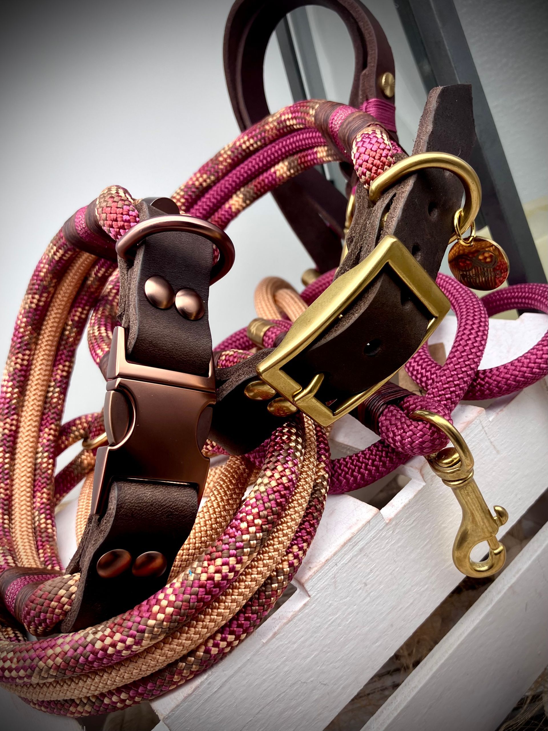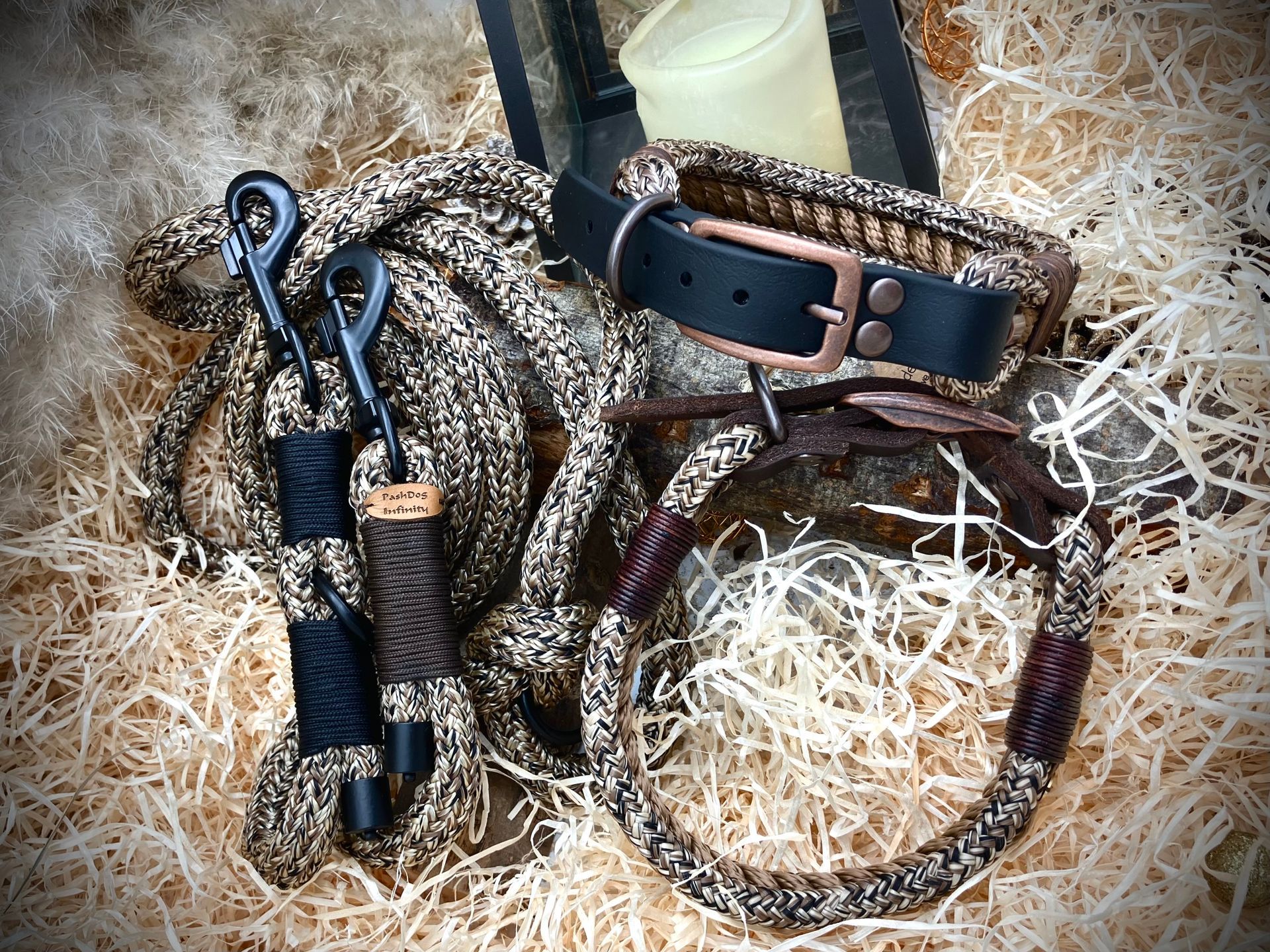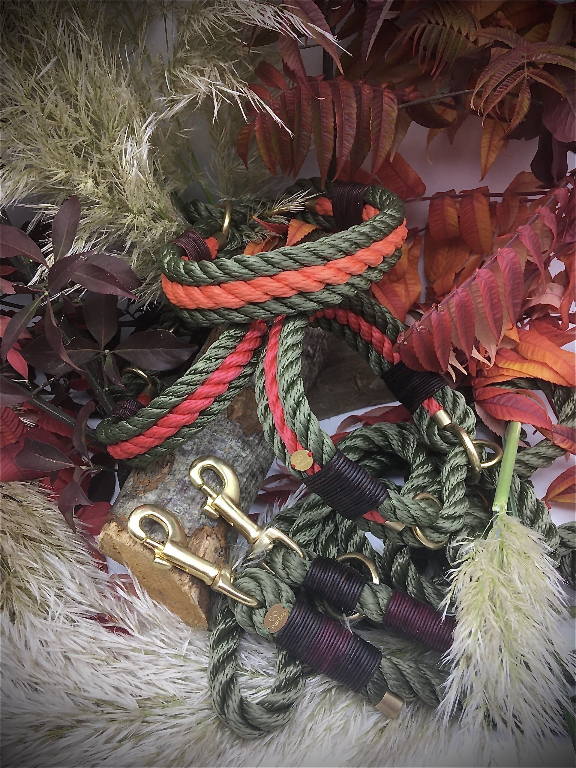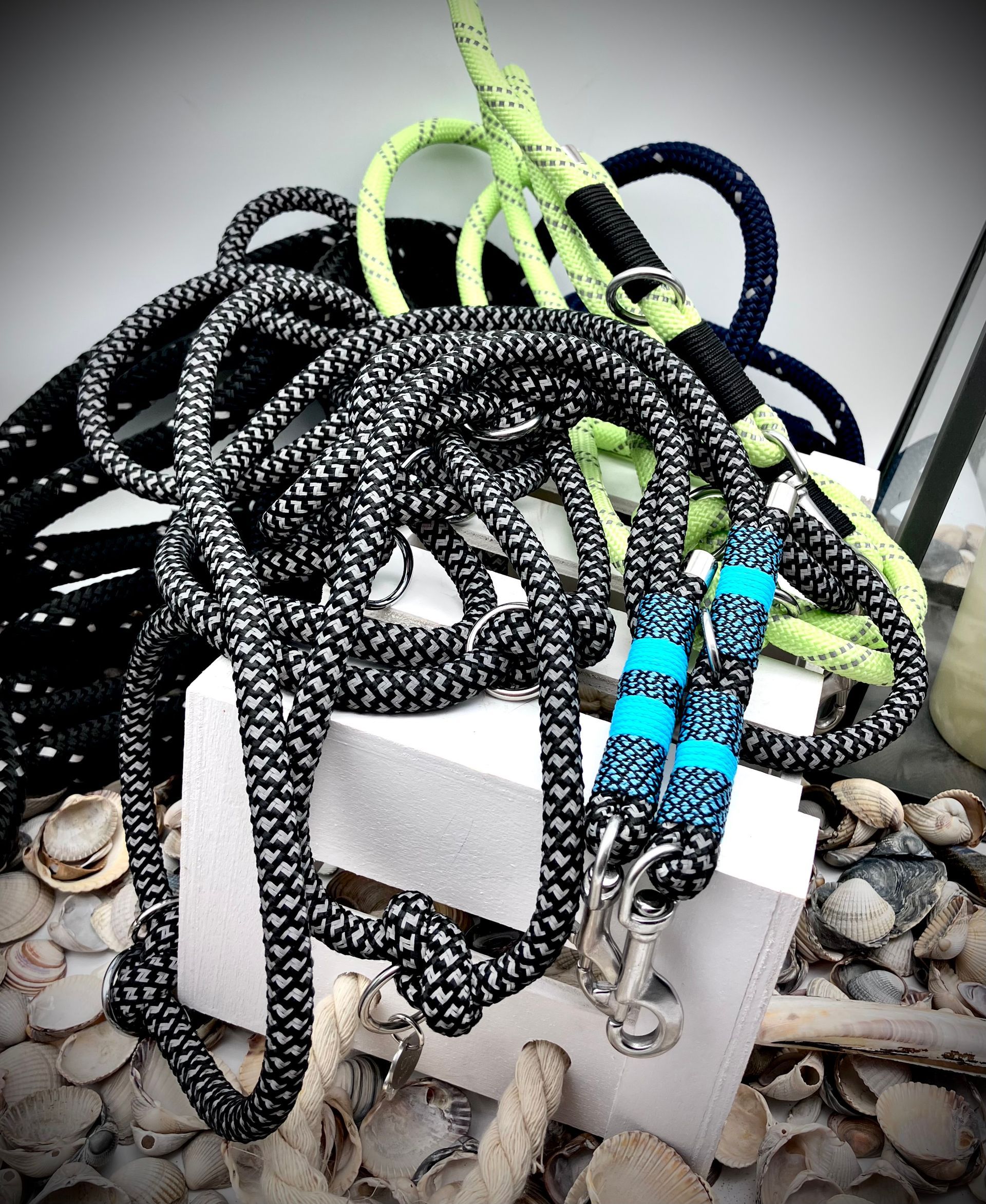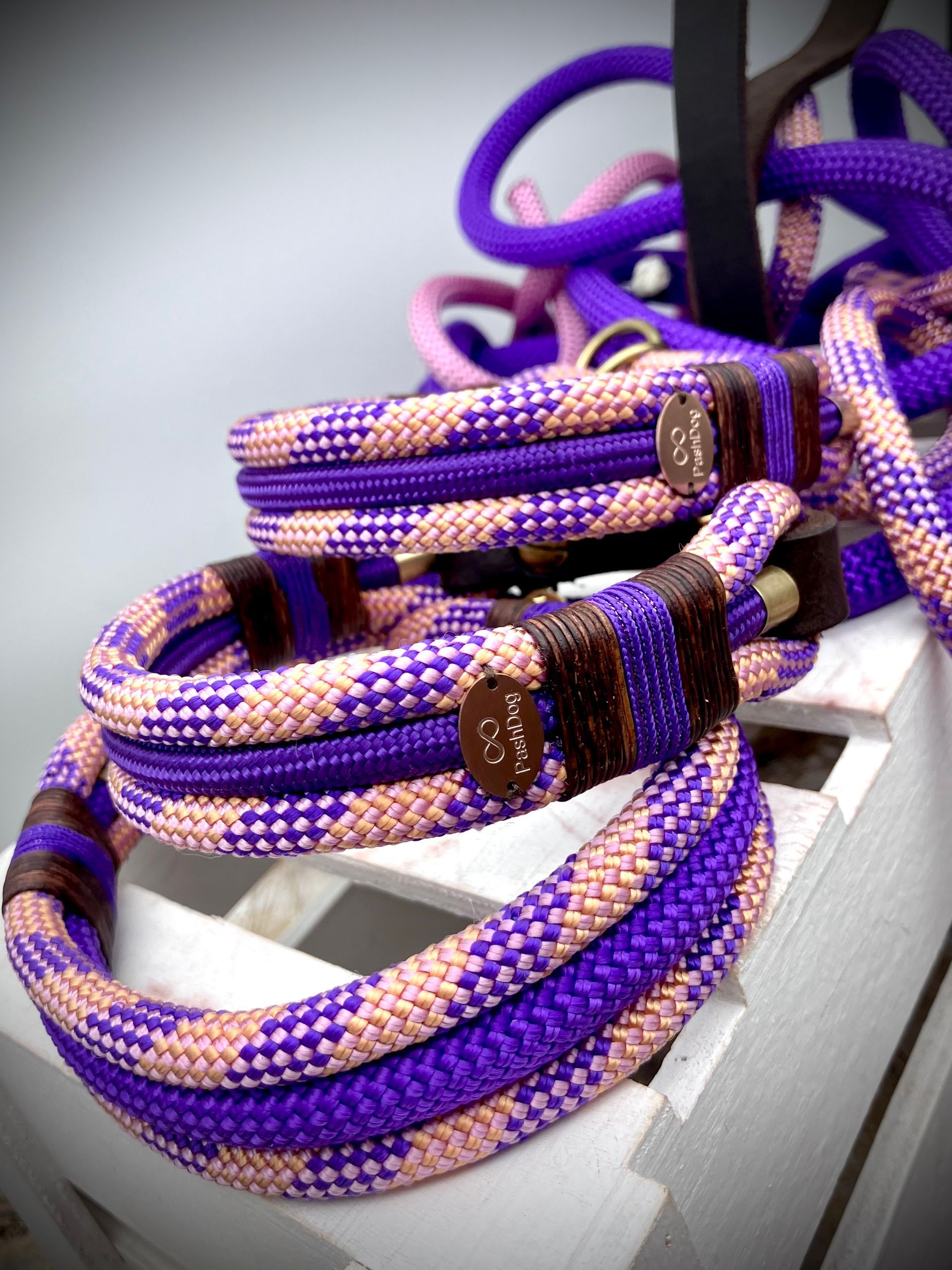 Ich fertige Hundehalsbänder und Hundeleinen entweder aus PPM-Seil (Gedreht, Rundseil, Spiralgeflecht), Hundeleinen-Seil kombiniert mit Fettleder oder aus Gurtband + Polsterung an.