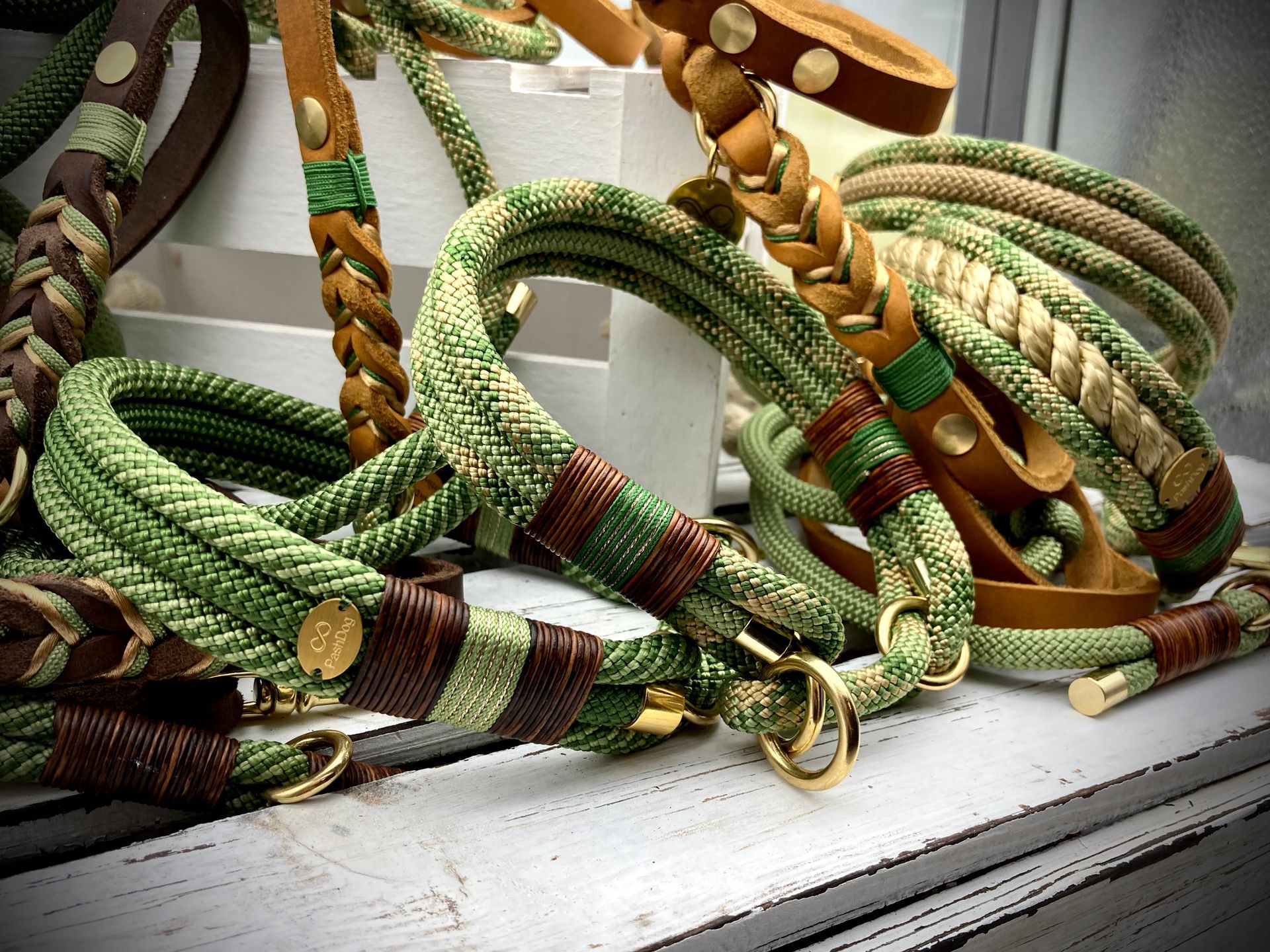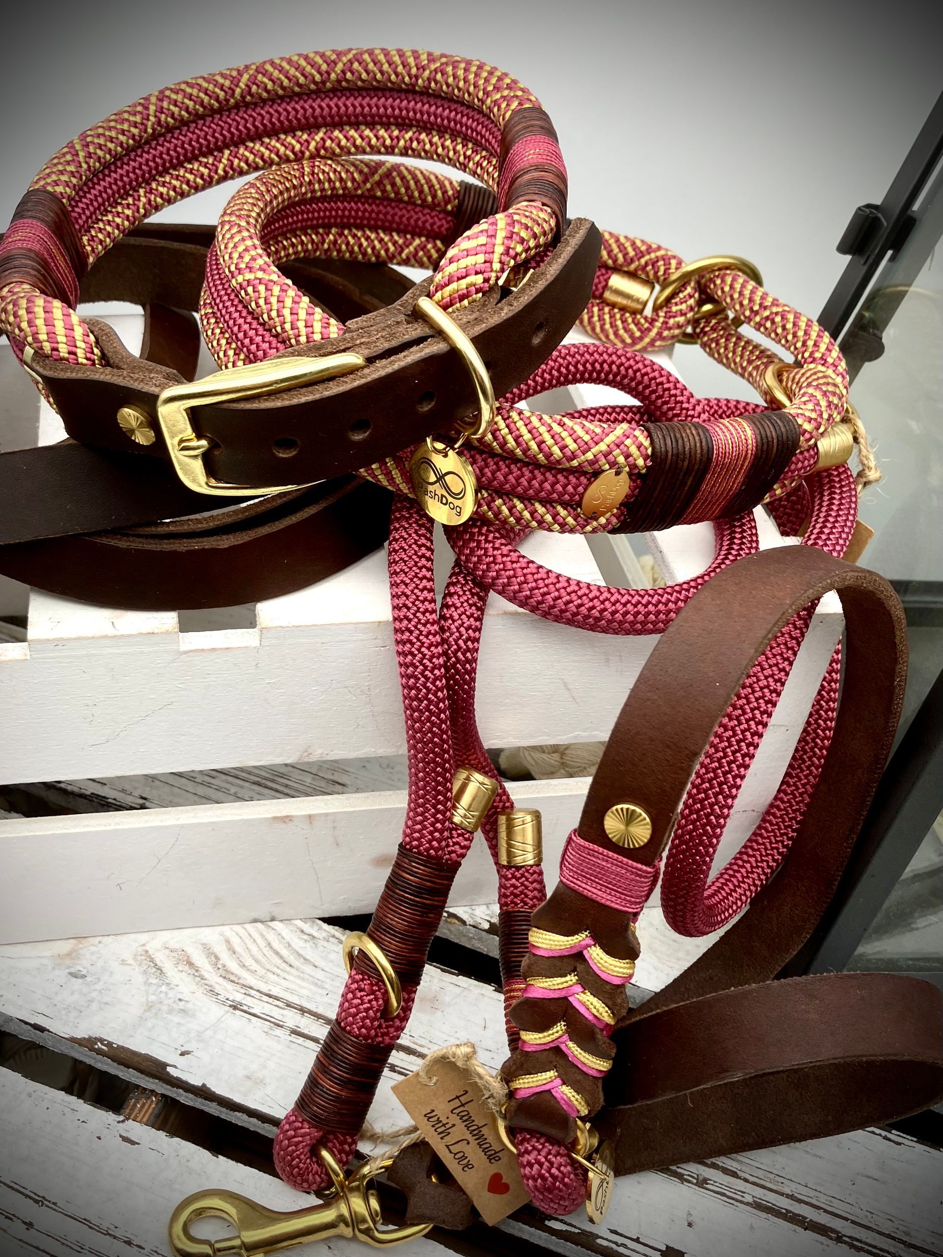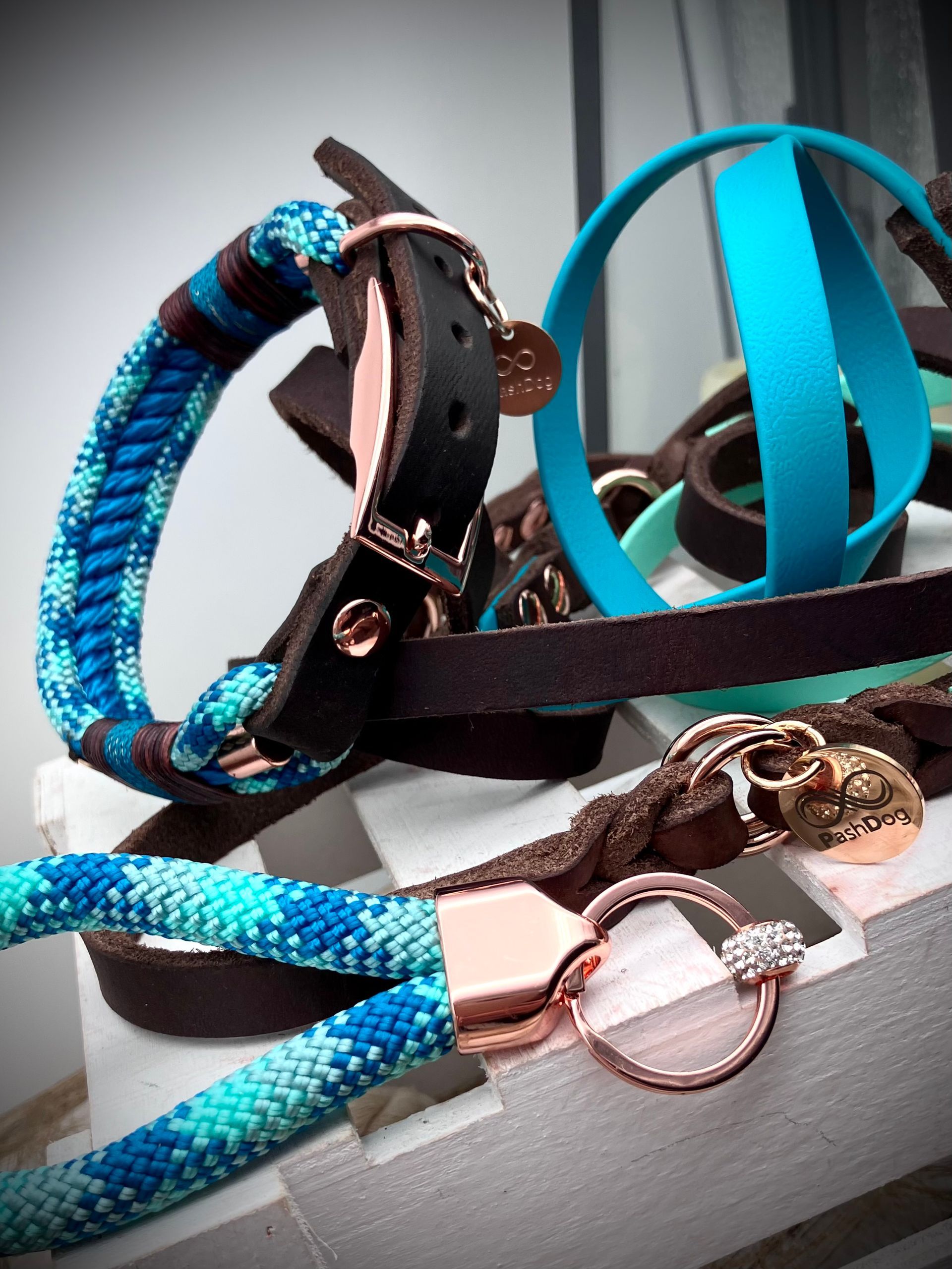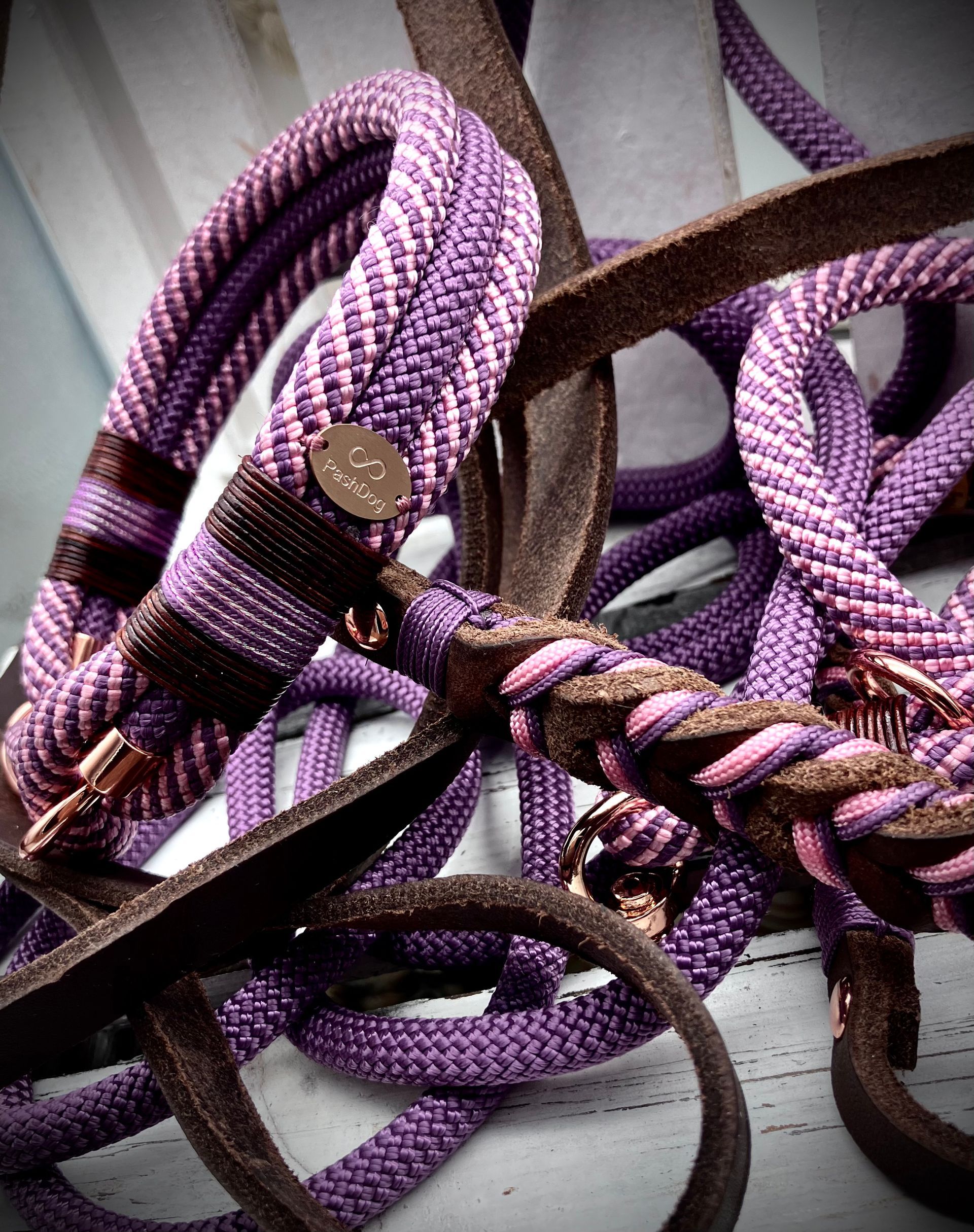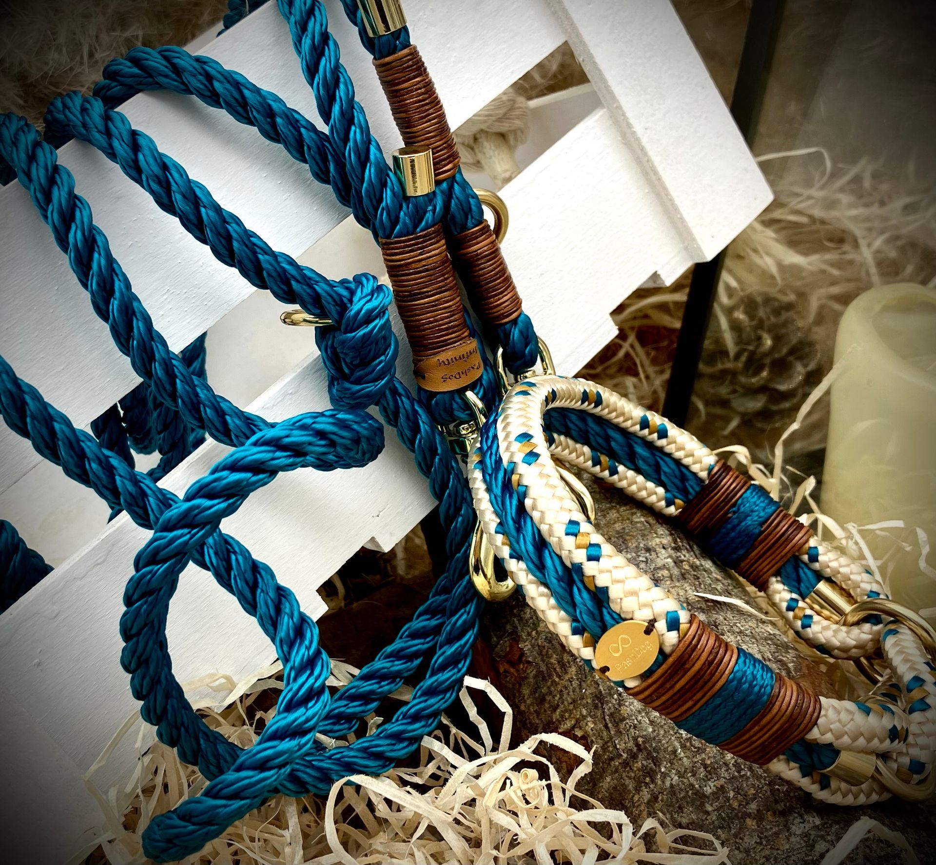 Ich fertige Hundehalsbänder und Hundeleinen entweder aus PPM-Seil (Gedreht, Rundseil, Spiralgeflecht), Hundeleinen-Seil kombiniert mit Fettleder oder aus Gurtband + Polsterung an.