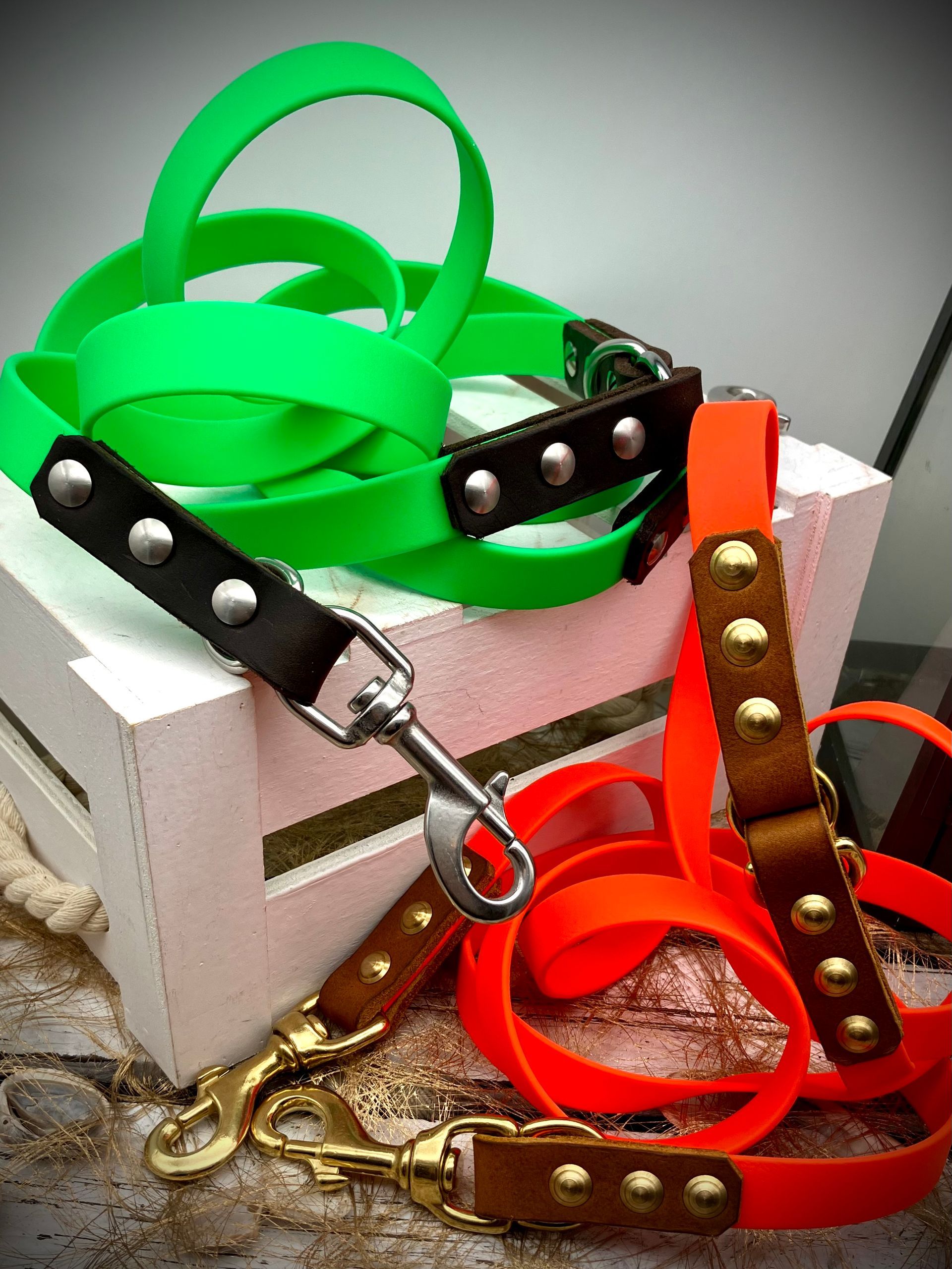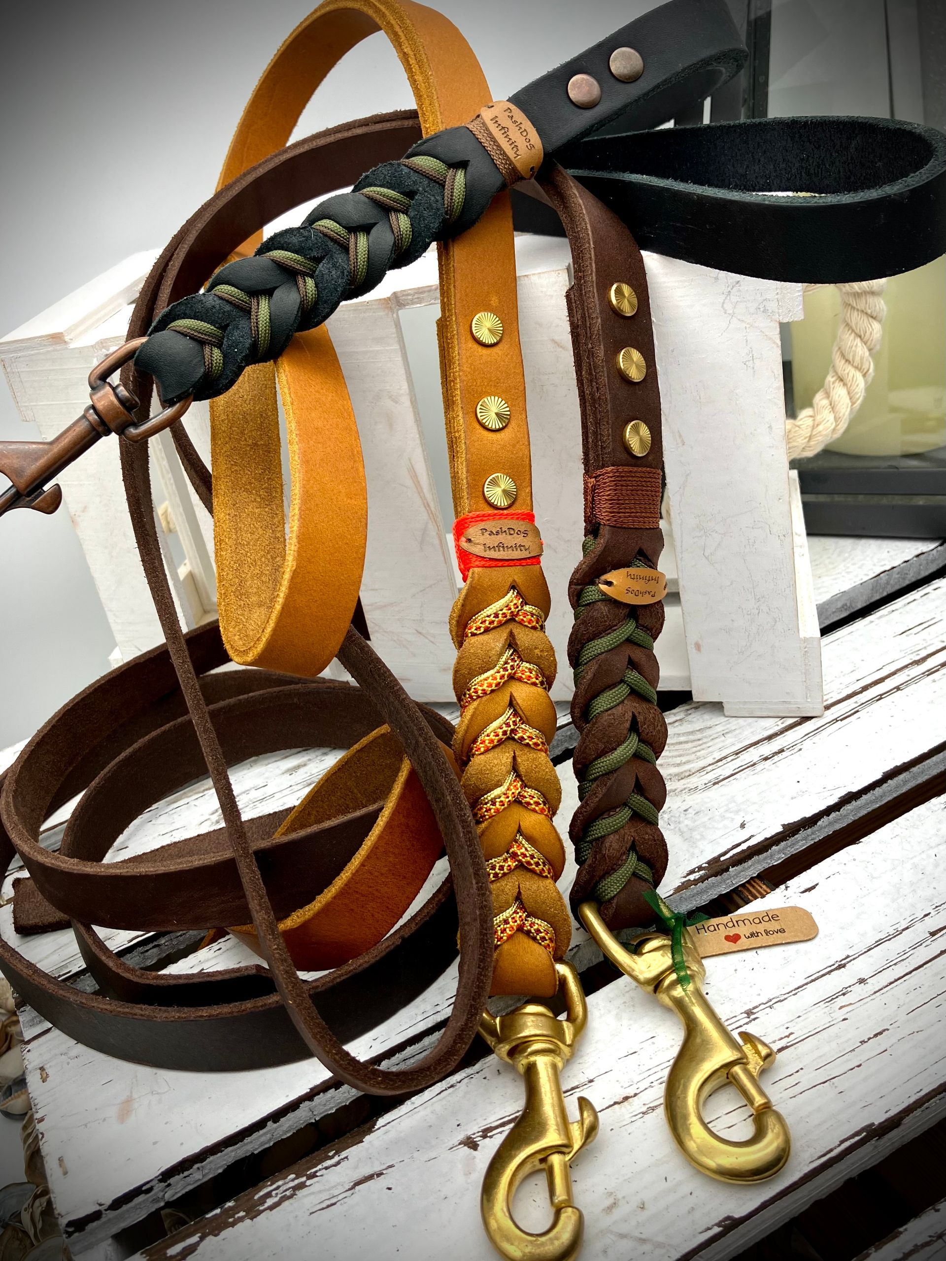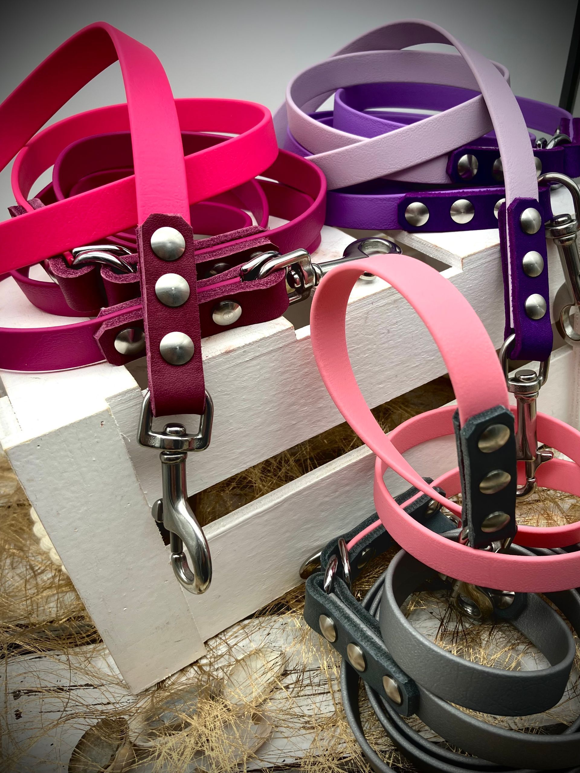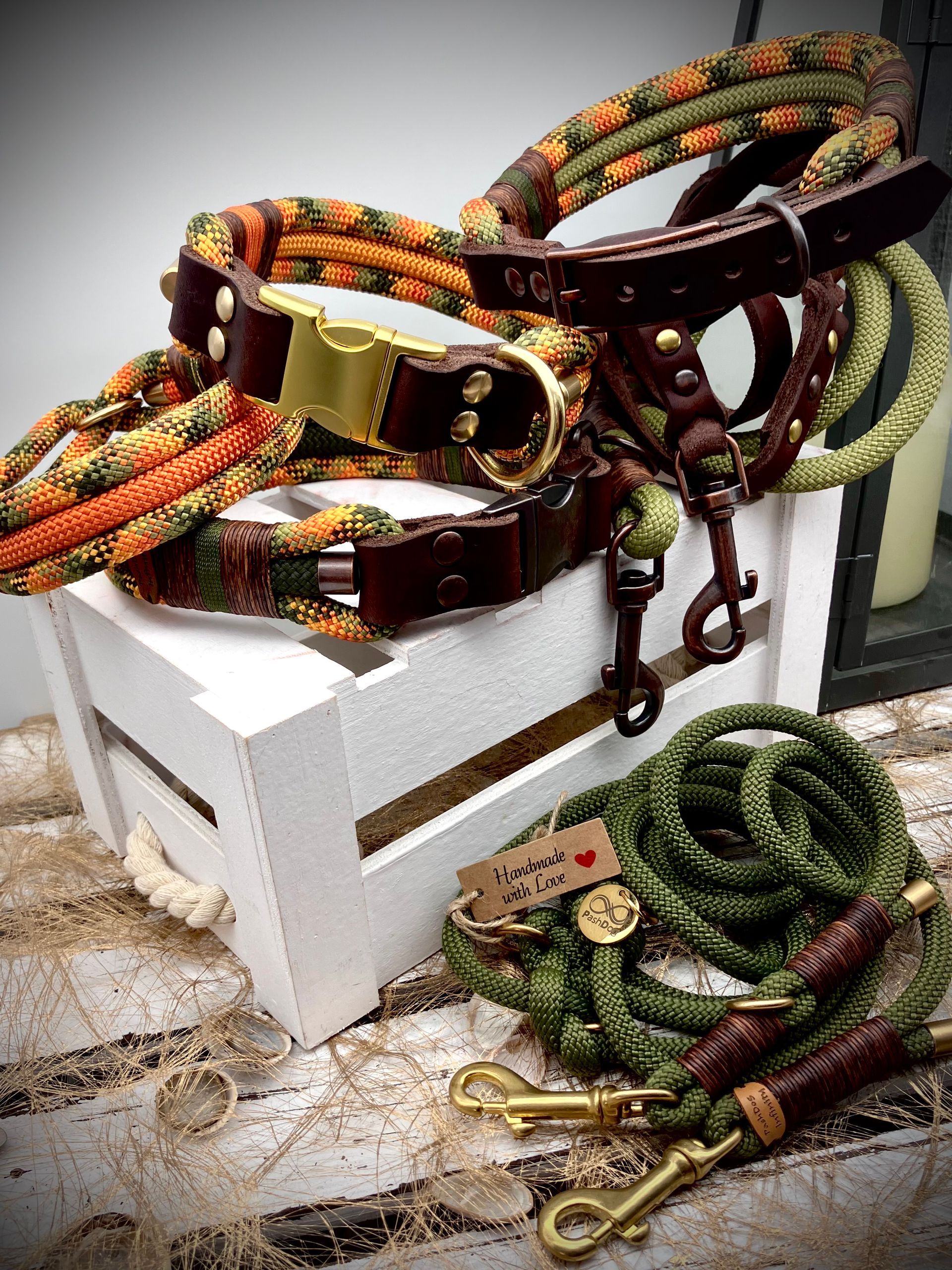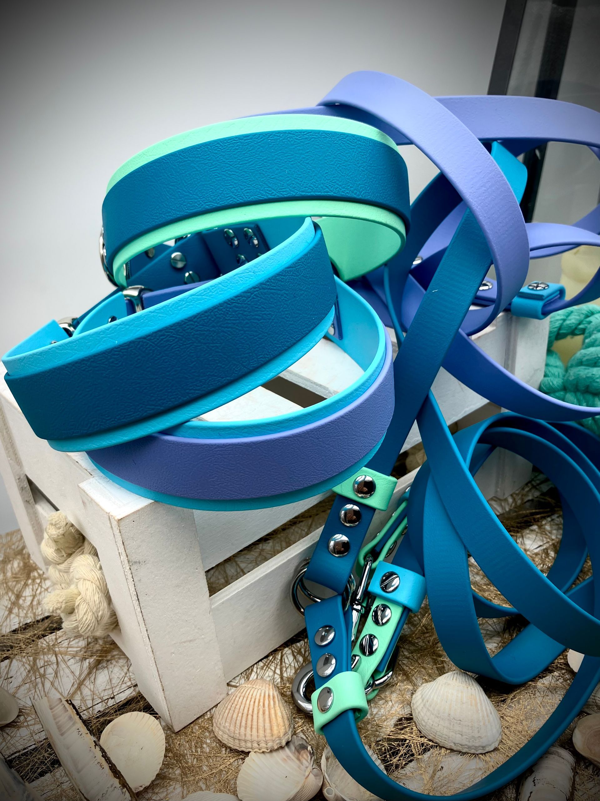 Ich fertige Hundehalsbänder und Hundeleinen entweder aus PPM-Seil (Gedreht, Rundseil, Spiralgeflecht), Hundeleinen-Seil kombiniert mit Fettleder oder aus Gurtband + Polsterung an.