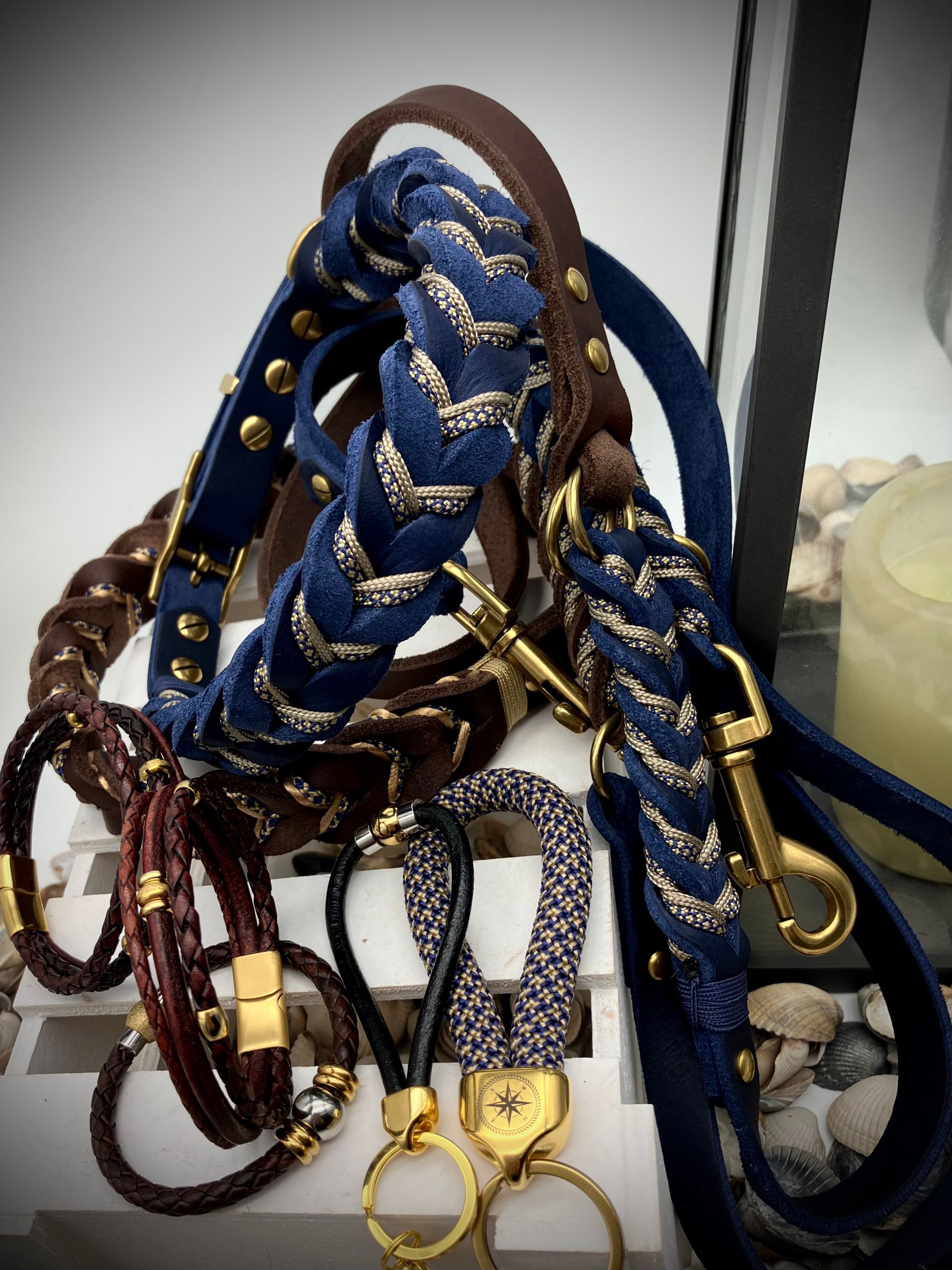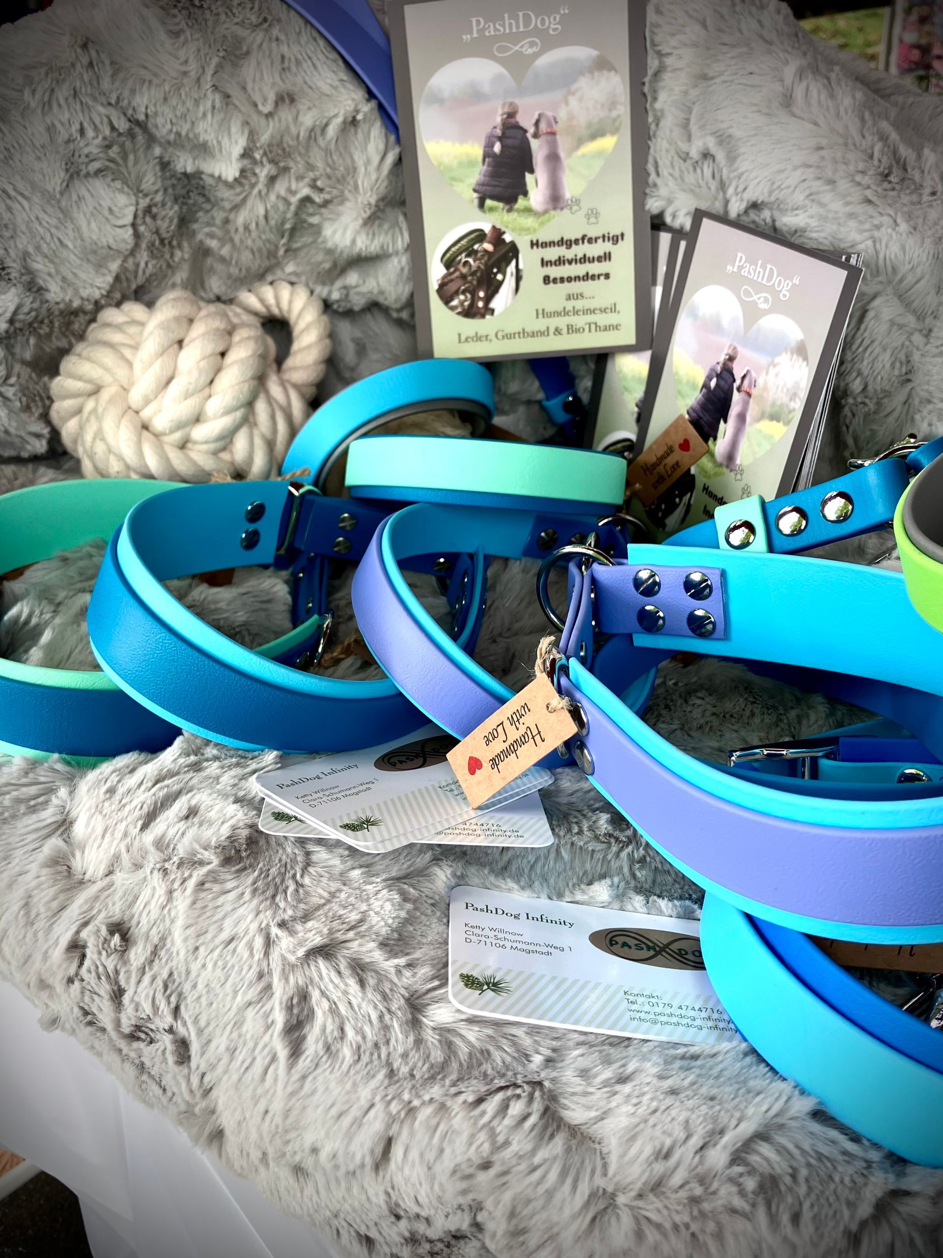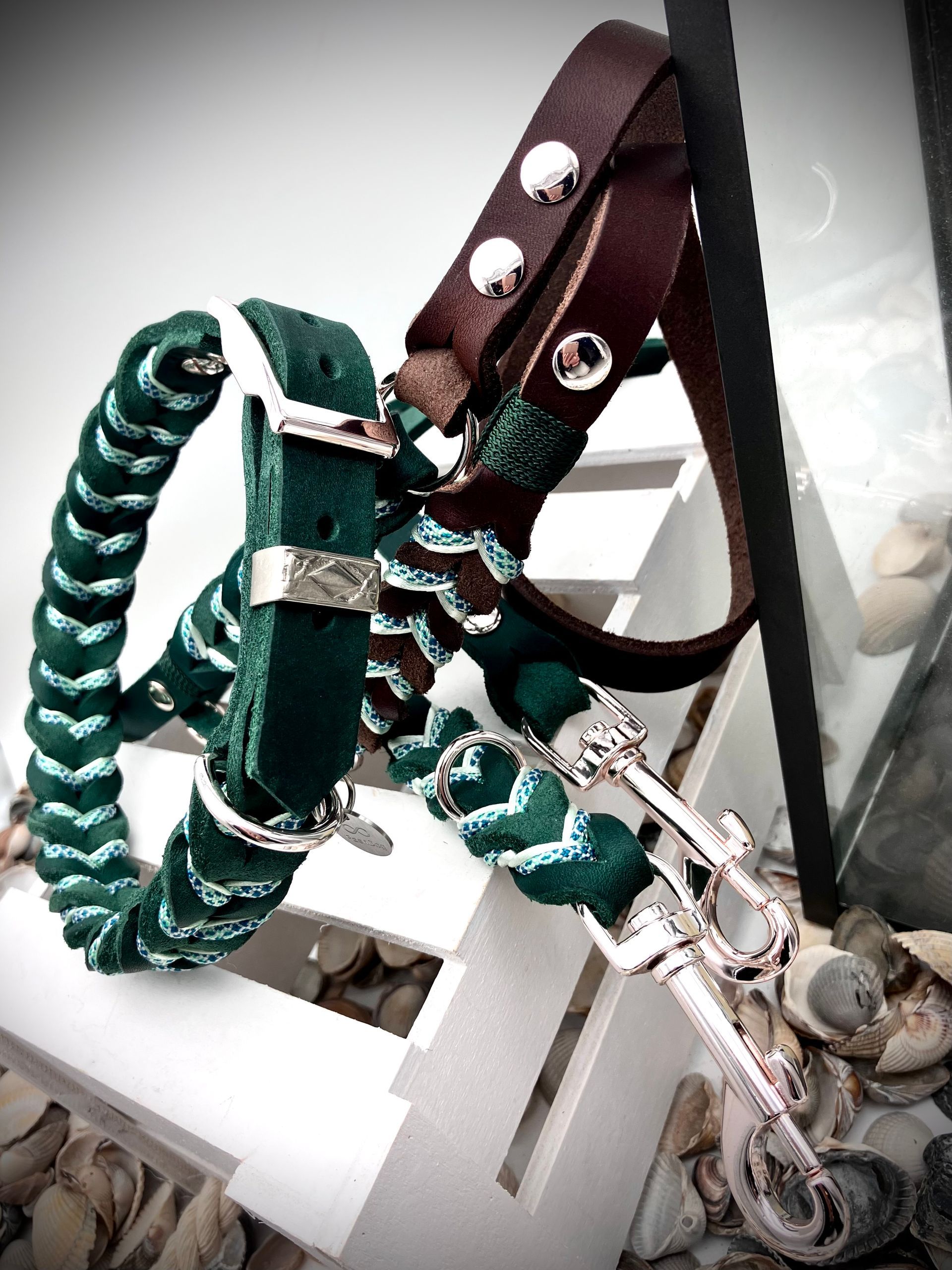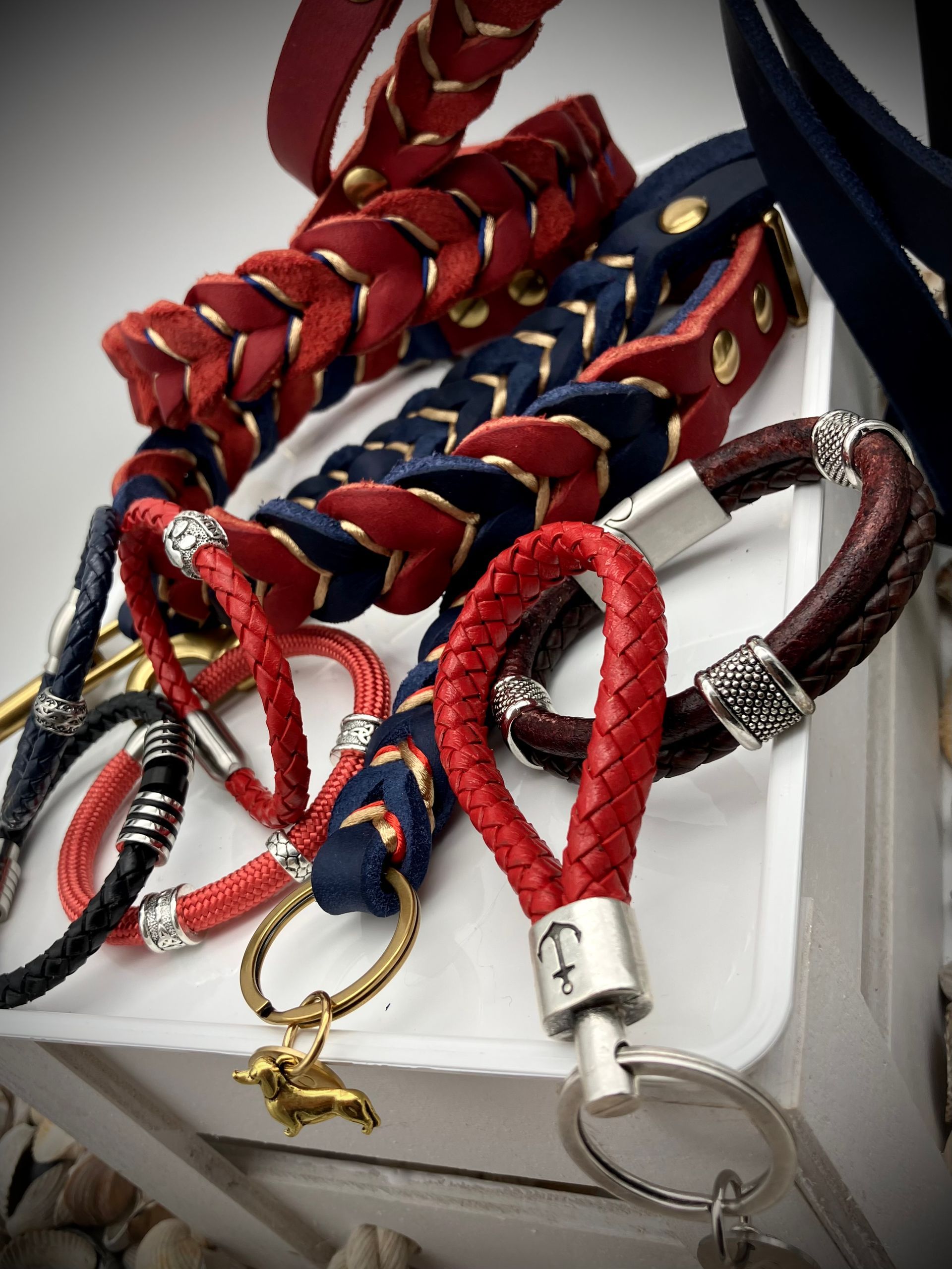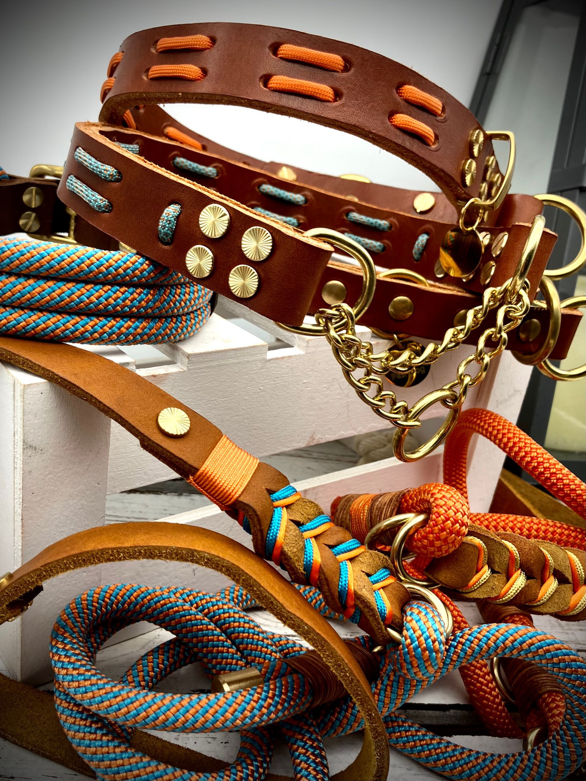 Meine handgefertigten Produkte sind alle maßangepasst und können in beinah unendlicher Vielfalt nach Eurem Wunsch angefertigt werden. Dafür müssen Hund und Besitzer nicht physisch präsent sein - über wenige, einfach zu ermittelnde Messwerte wird die Basis für ein perfekt sitzendes Halsband oder Geschirr übermittelt. Die Auswahl an Farben und Beschlägen richtet sich nach Euren Wünschen und wird innerhalb kürzester Zeit in wenigen Beratungsgesprächen finalisiert.