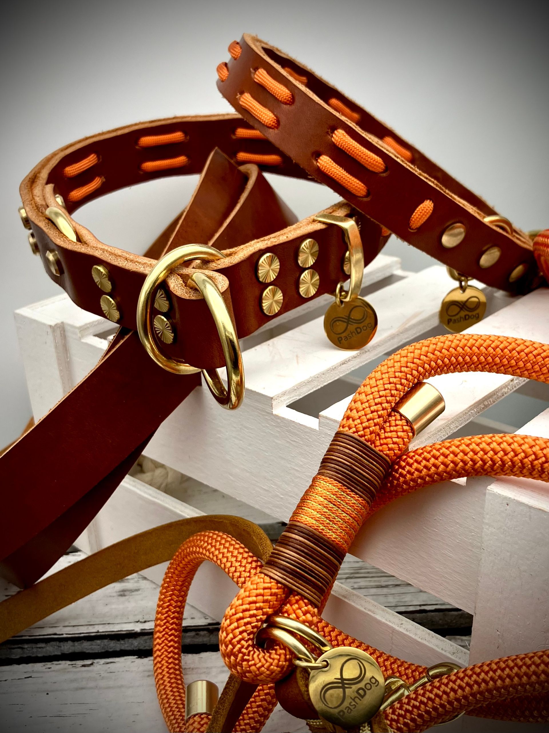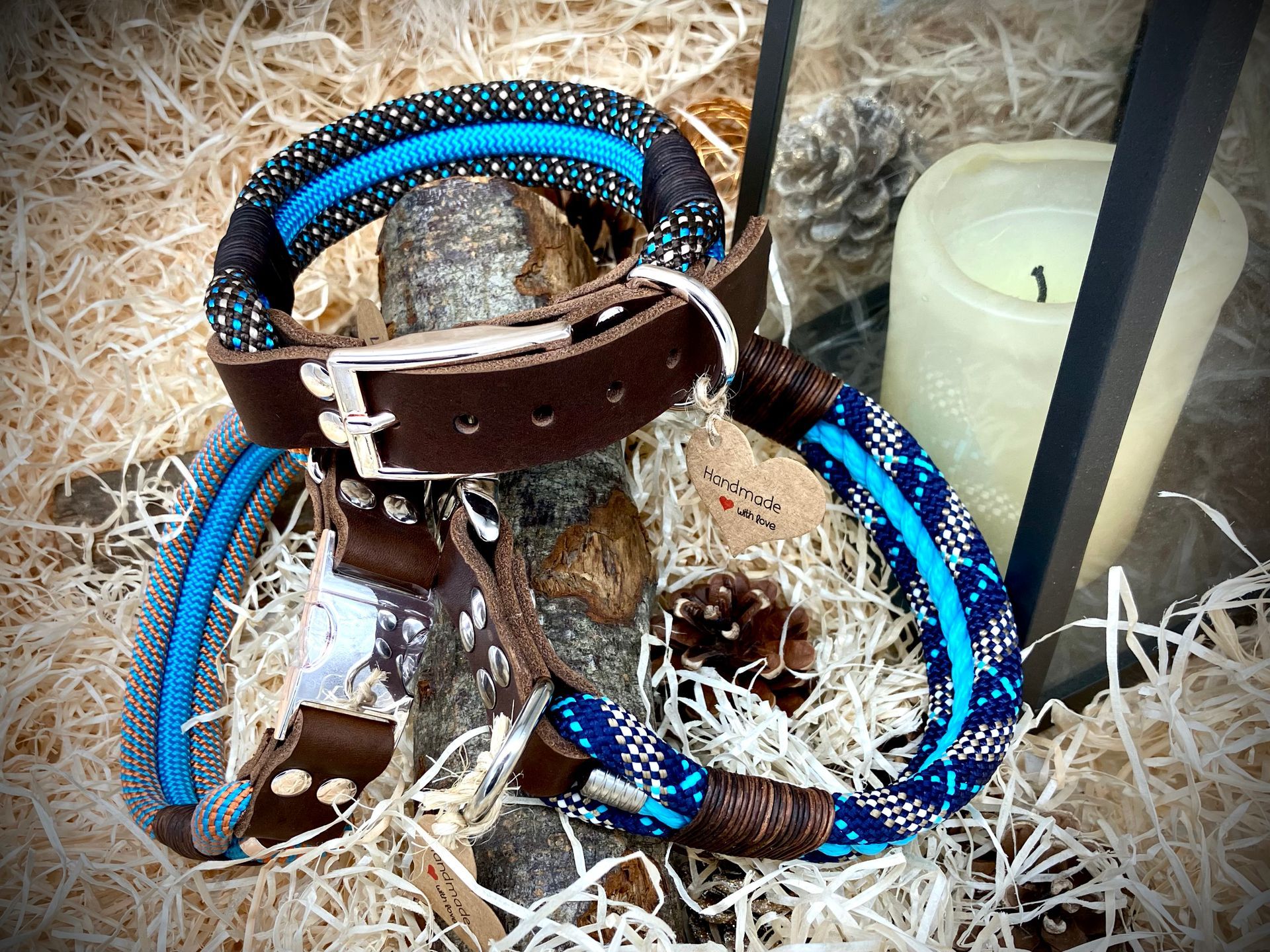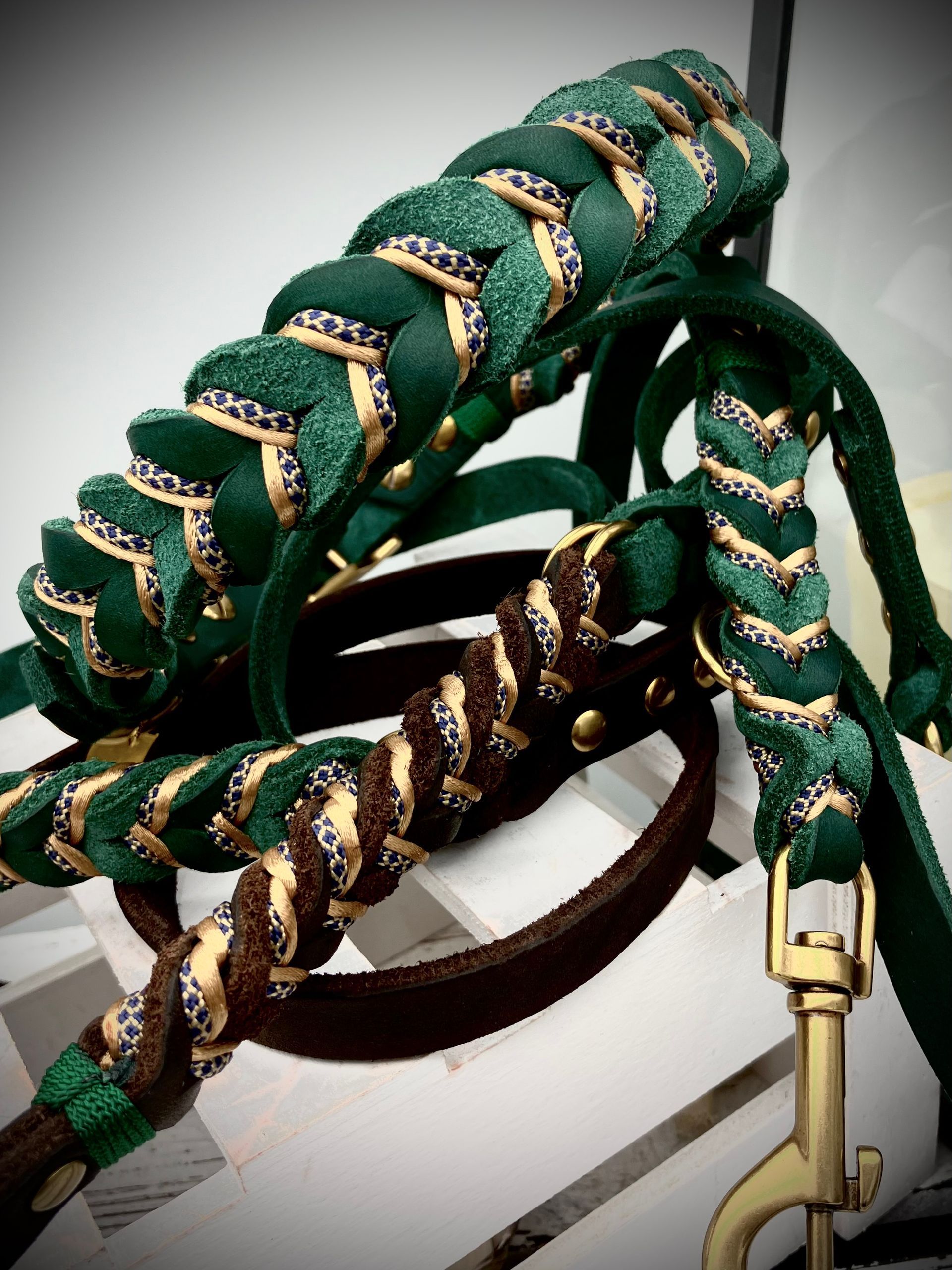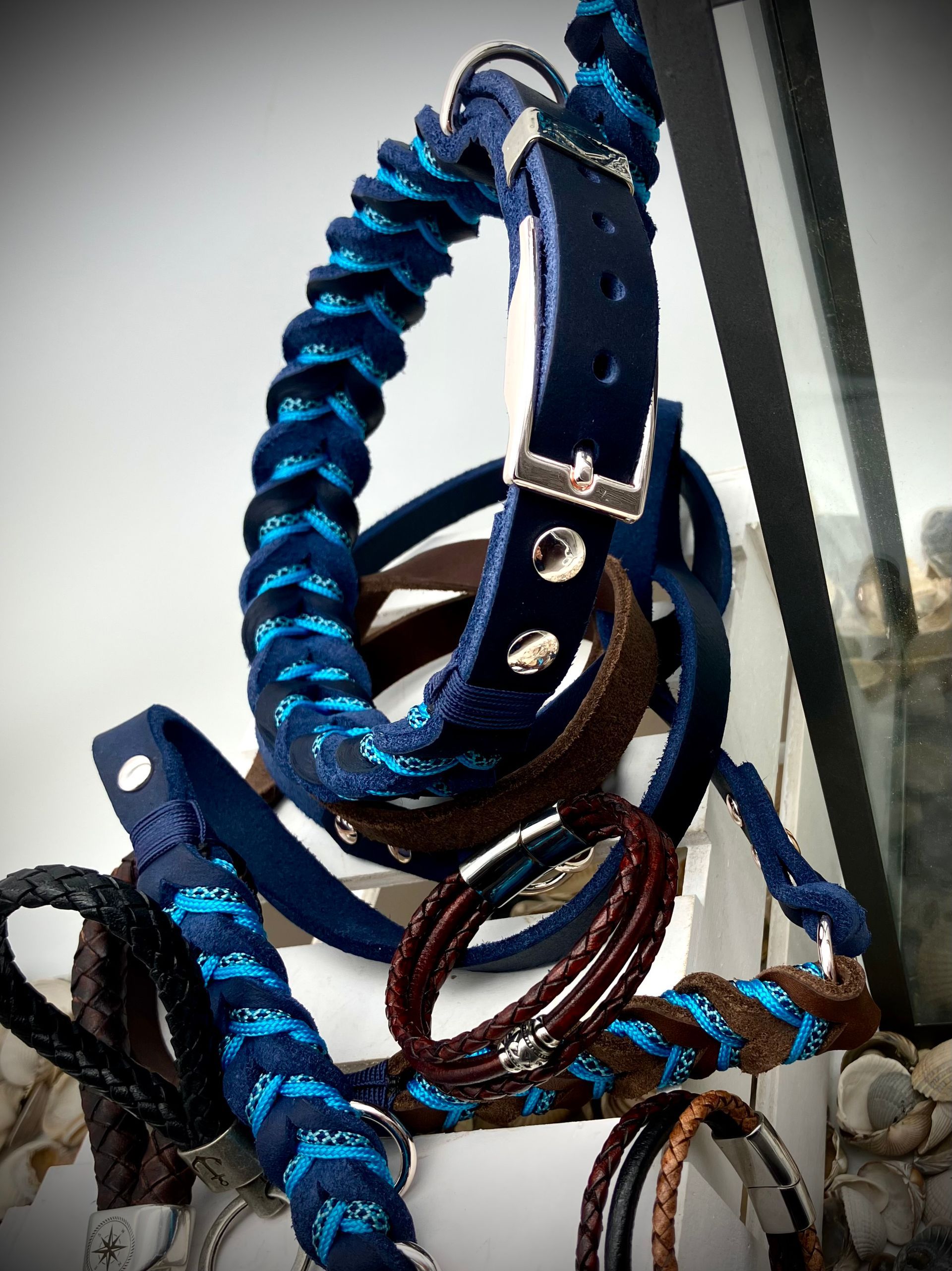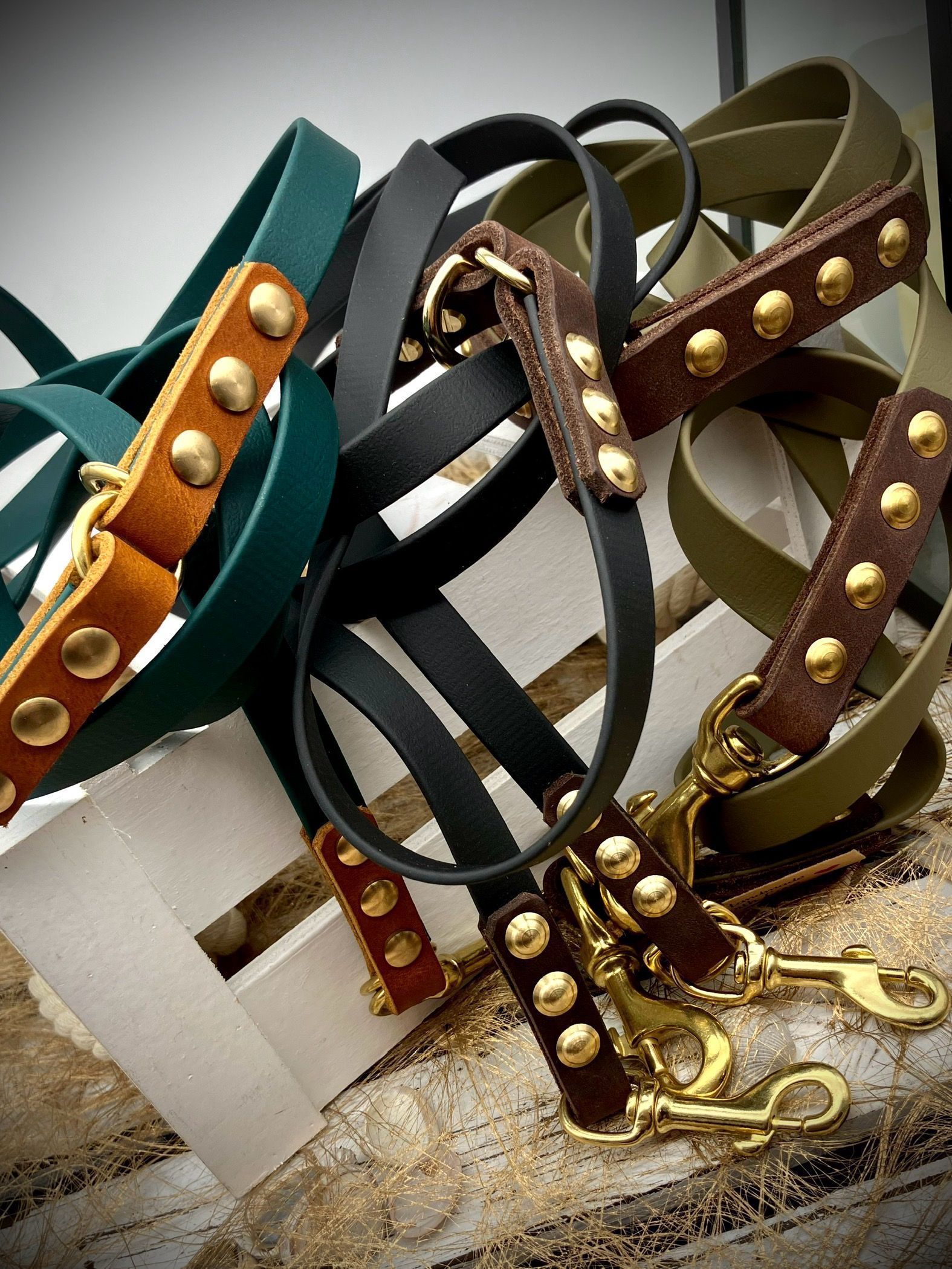 Meine handgefertigten Produkte sind alle maßangepasst und können in beinah unendlicher Vielfalt nach Eurem Wunsch angefertigt werden. Dafür müssen Hund und Besitzer nicht physisch präsent sein - über wenige, einfach zu ermittelnde Messwerte wird die Basis für ein perfekt sitzendes Halsband oder Geschirr übermittelt. Die Auswahl an Farben und Beschlägen richtet sich nach Euren Wünschen und wird innerhalb kürzester Zeit in wenigen Beratungsgesprächen finalisiert.