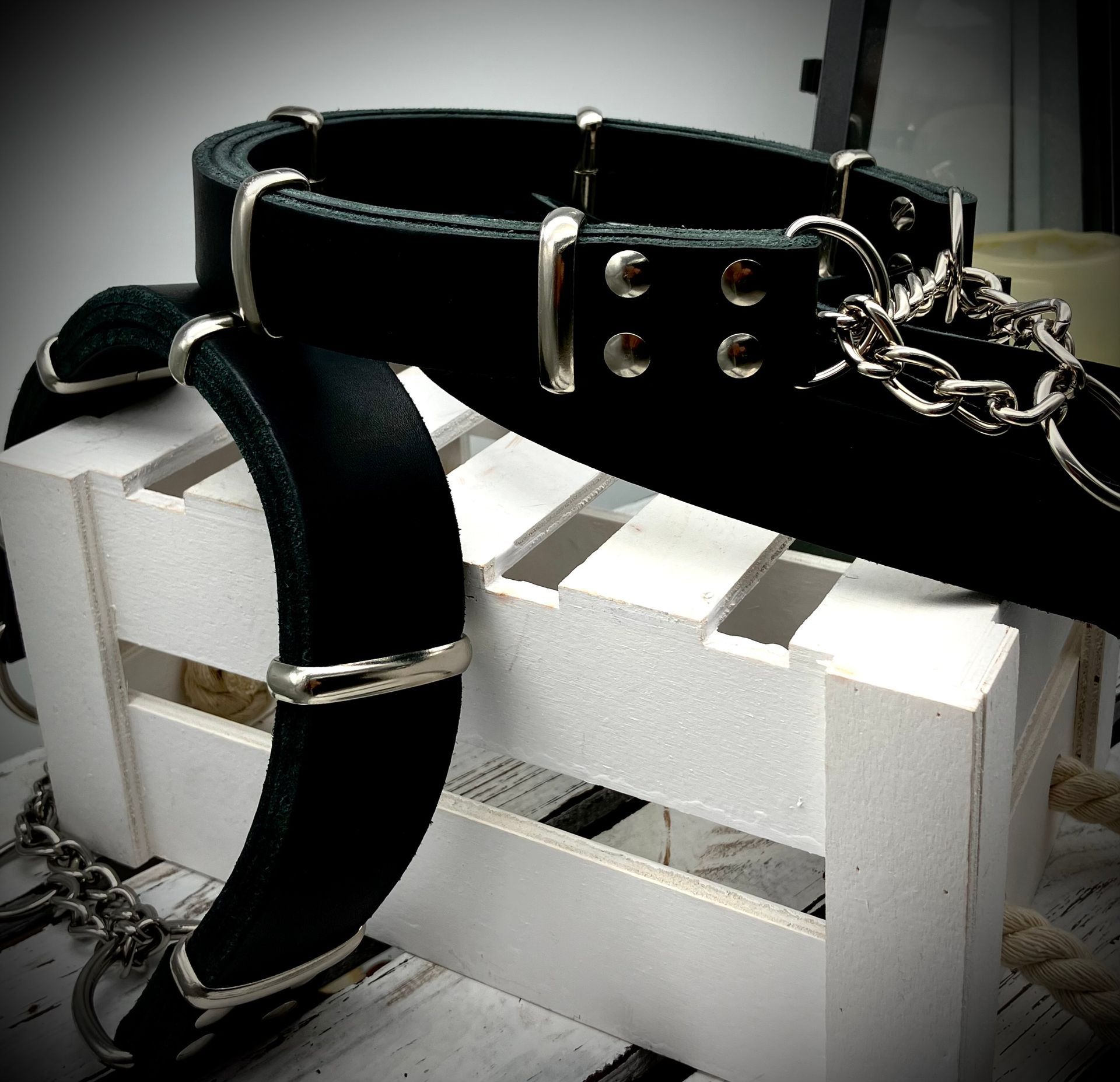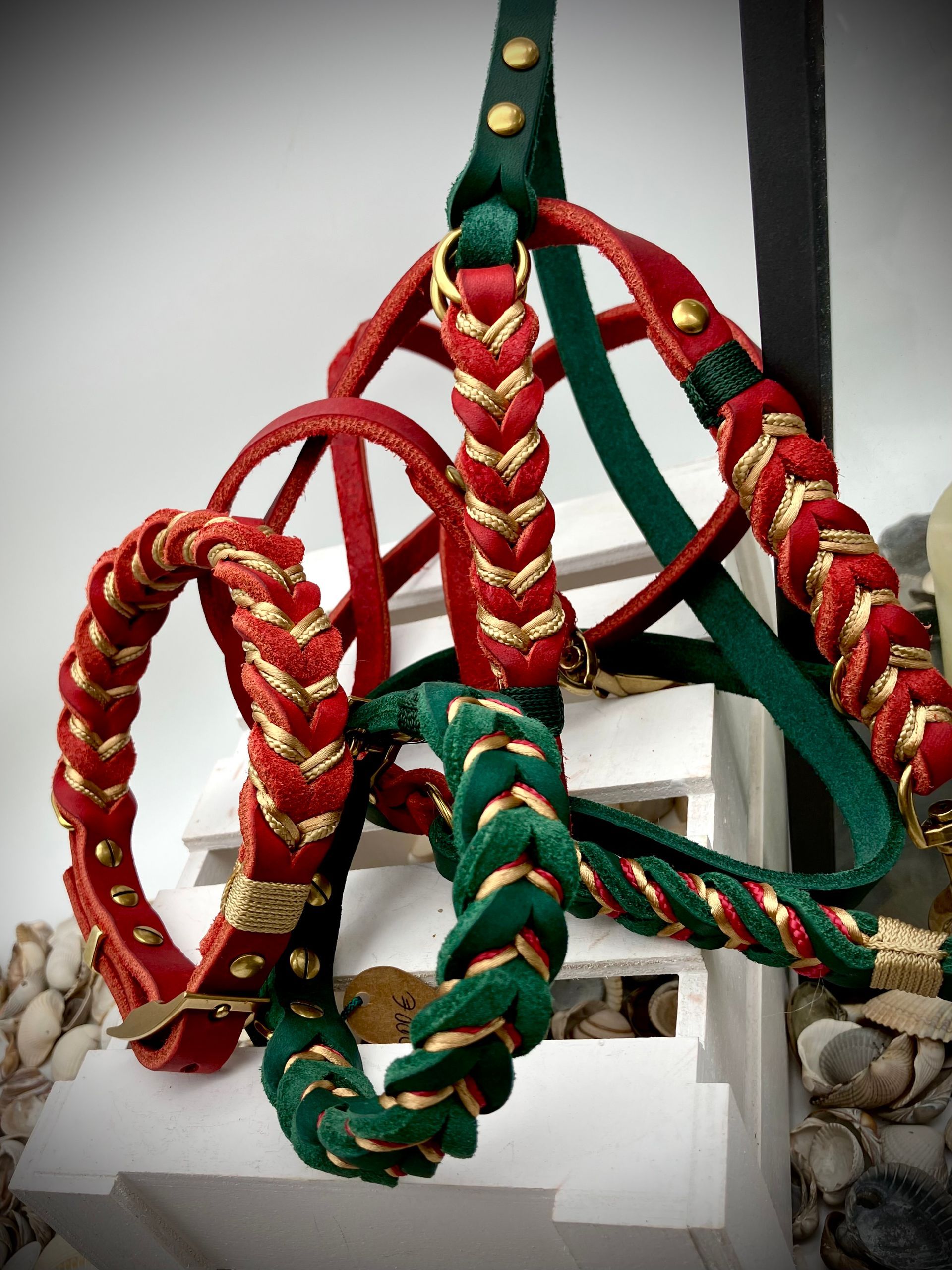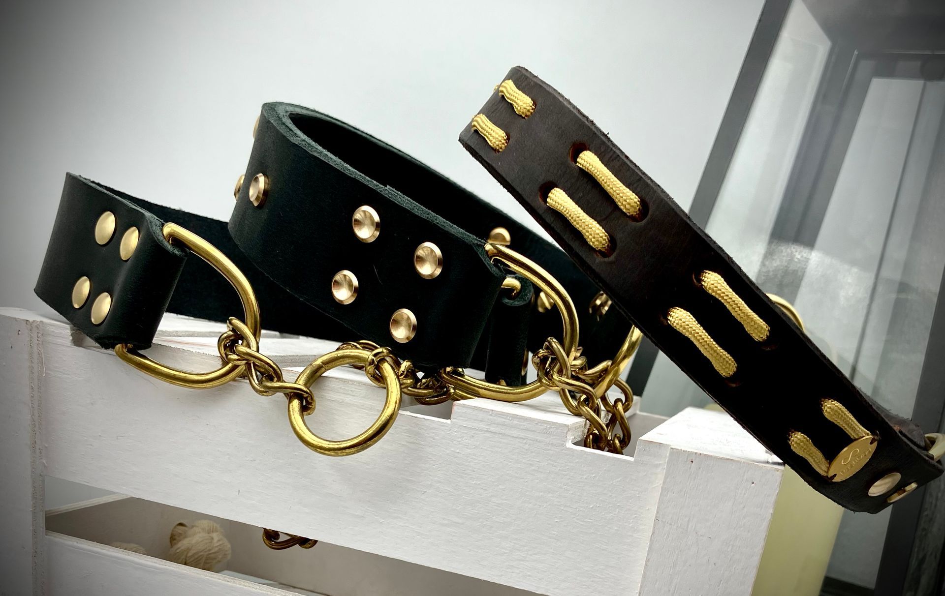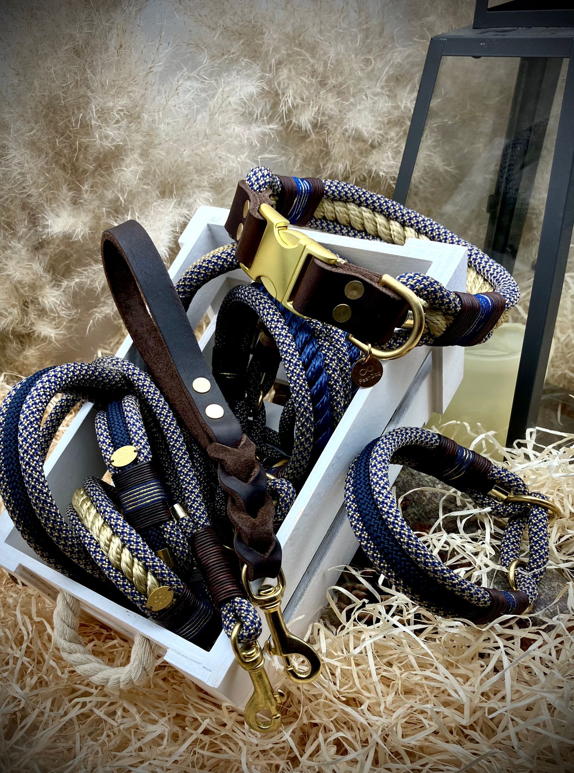 Meine handgefertigten Produkte sind alle maßangepasst und können in beinah unendlicher Vielfalt nach Eurem Wunsch angefertigt werden. Dafür müssen Hund und Besitzer nicht physisch präsent sein - über wenige, einfach zu ermittelnde Messwerte wird die Basis für ein perfekt sitzendes Halsband oder Geschirr übermittelt. Die Auswahl an Farben und Beschlägen richtet sich nach Euren Wünschen und wird innerhalb kürzester Zeit in wenigen Beratungsgesprächen finalisiert.