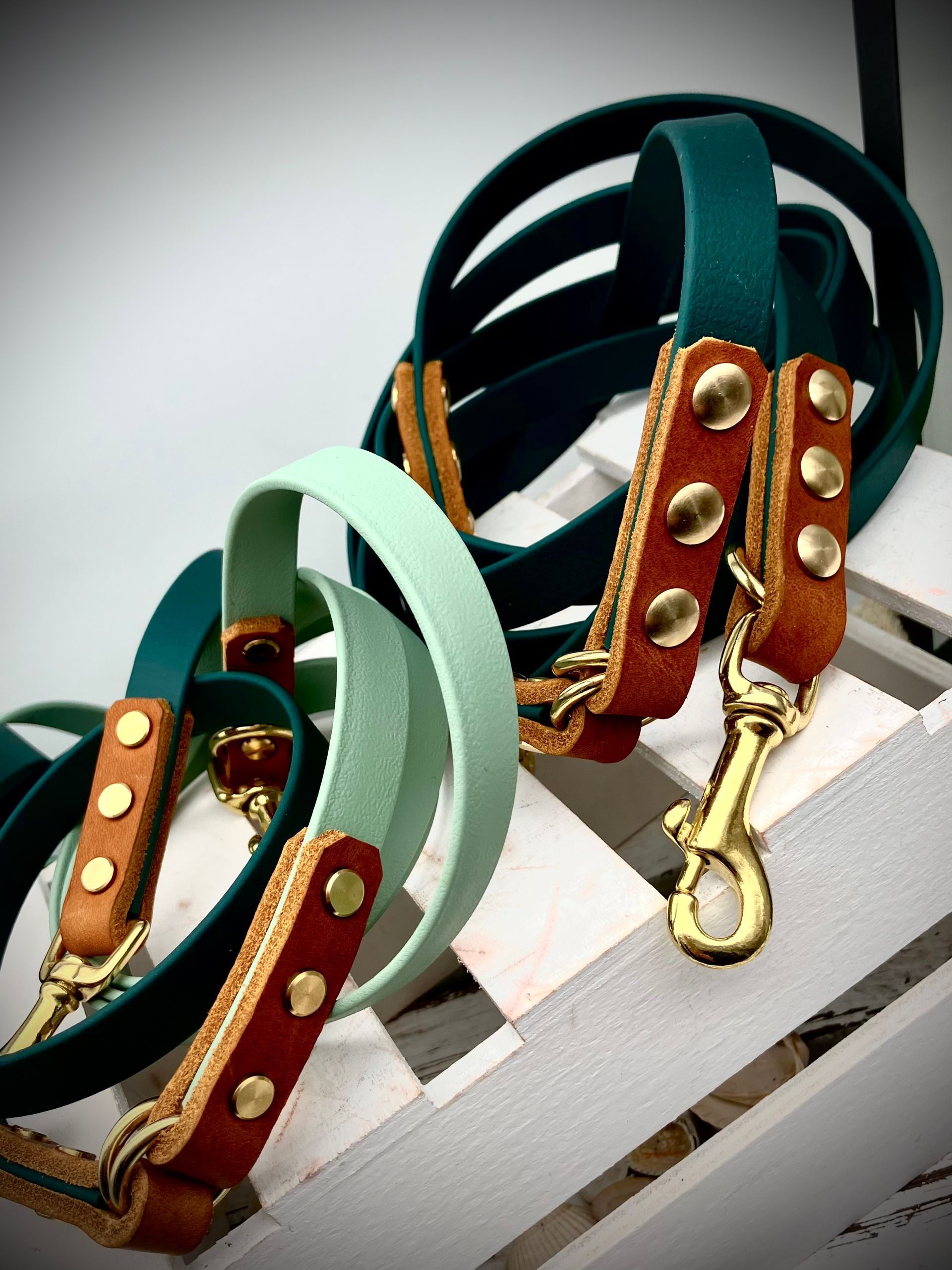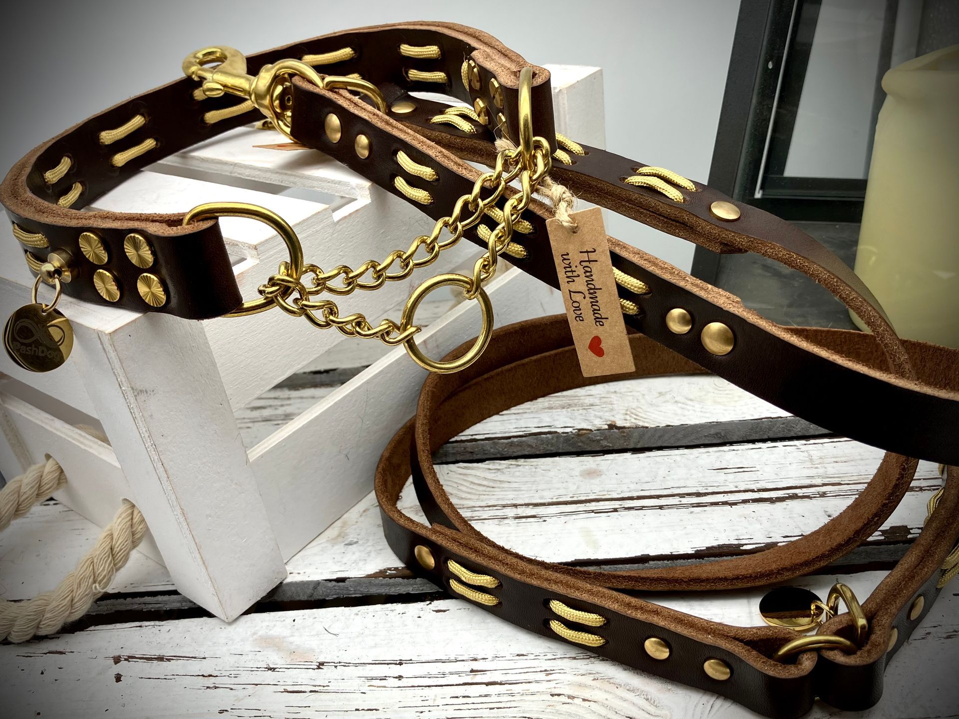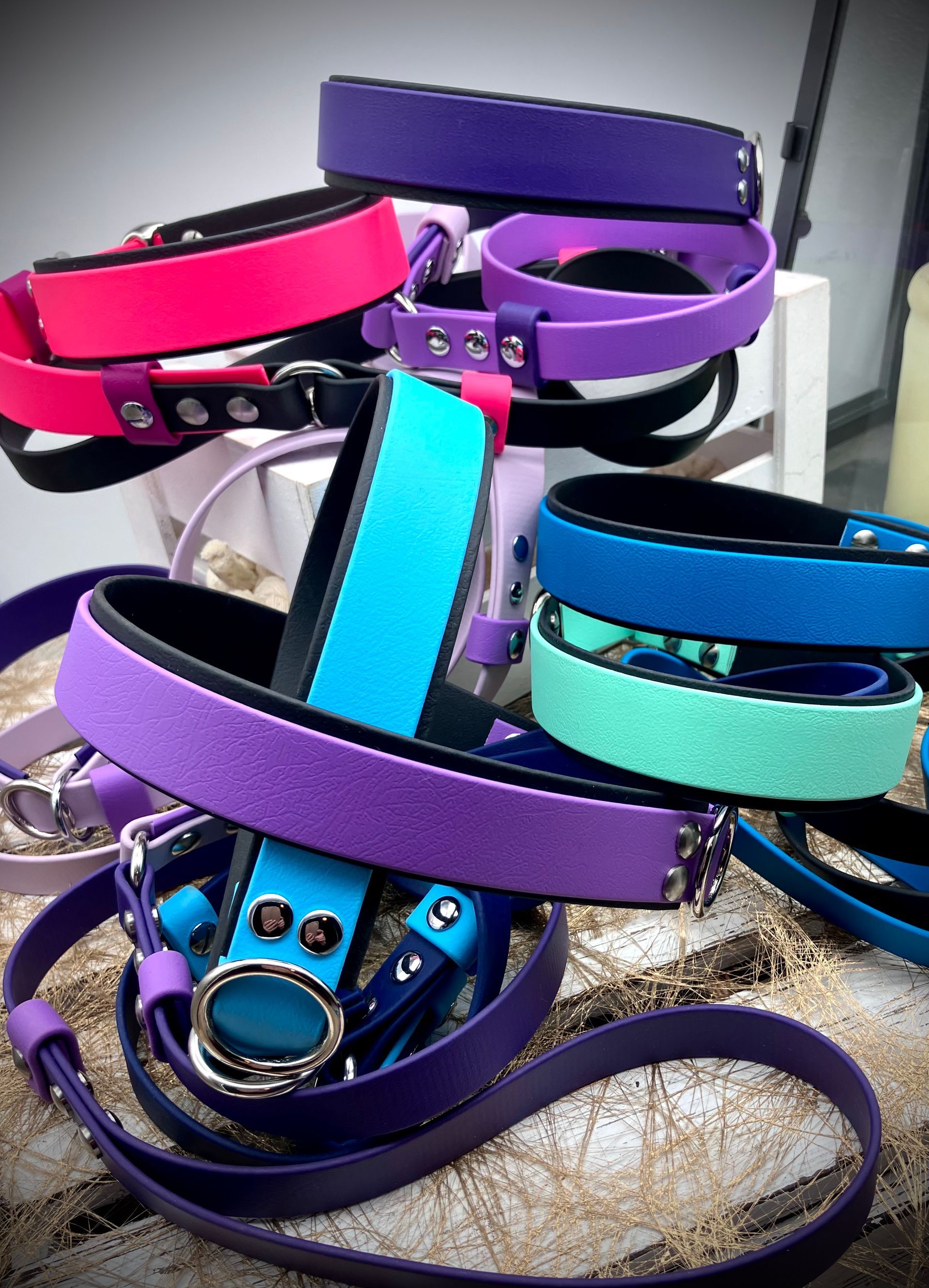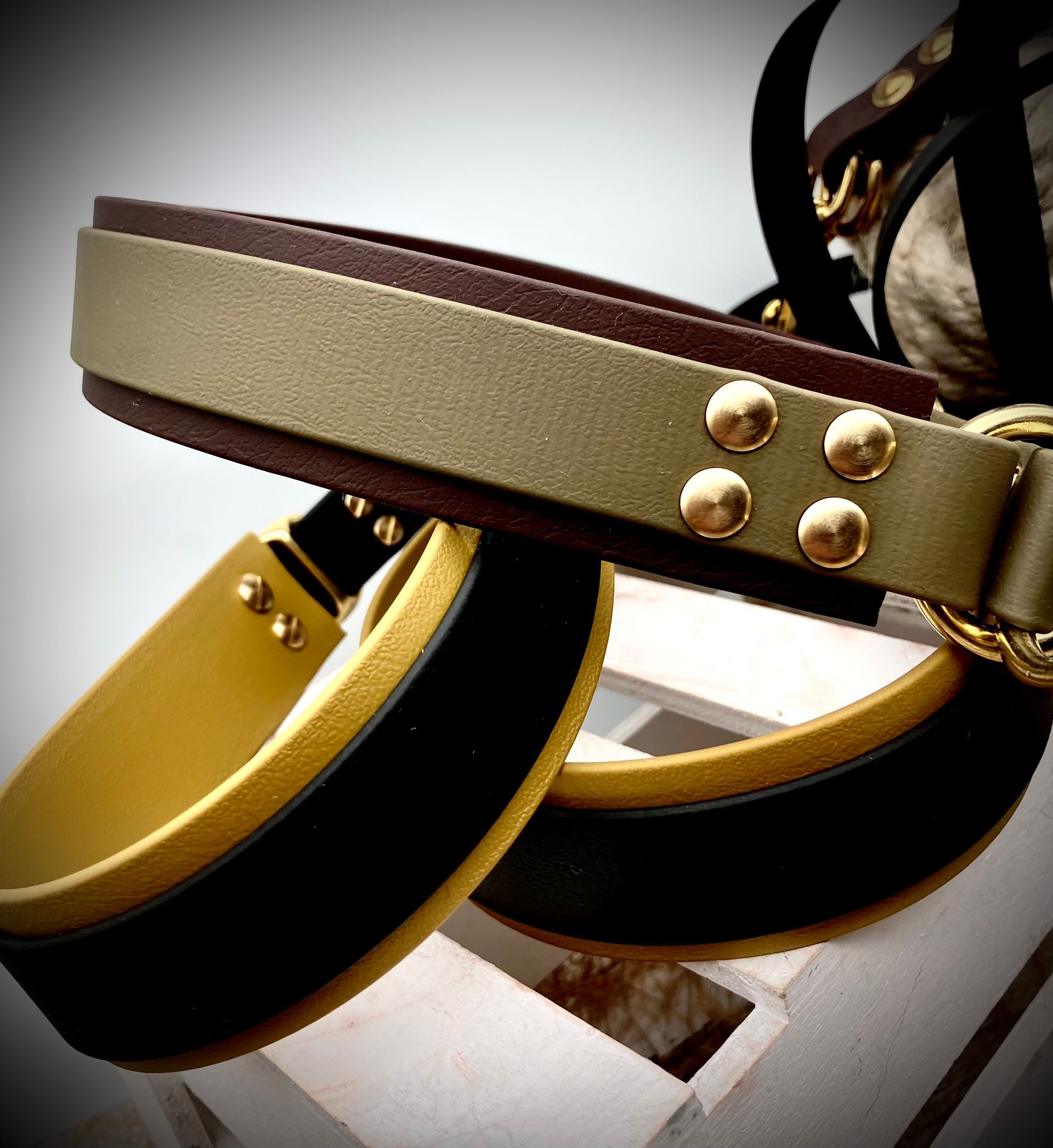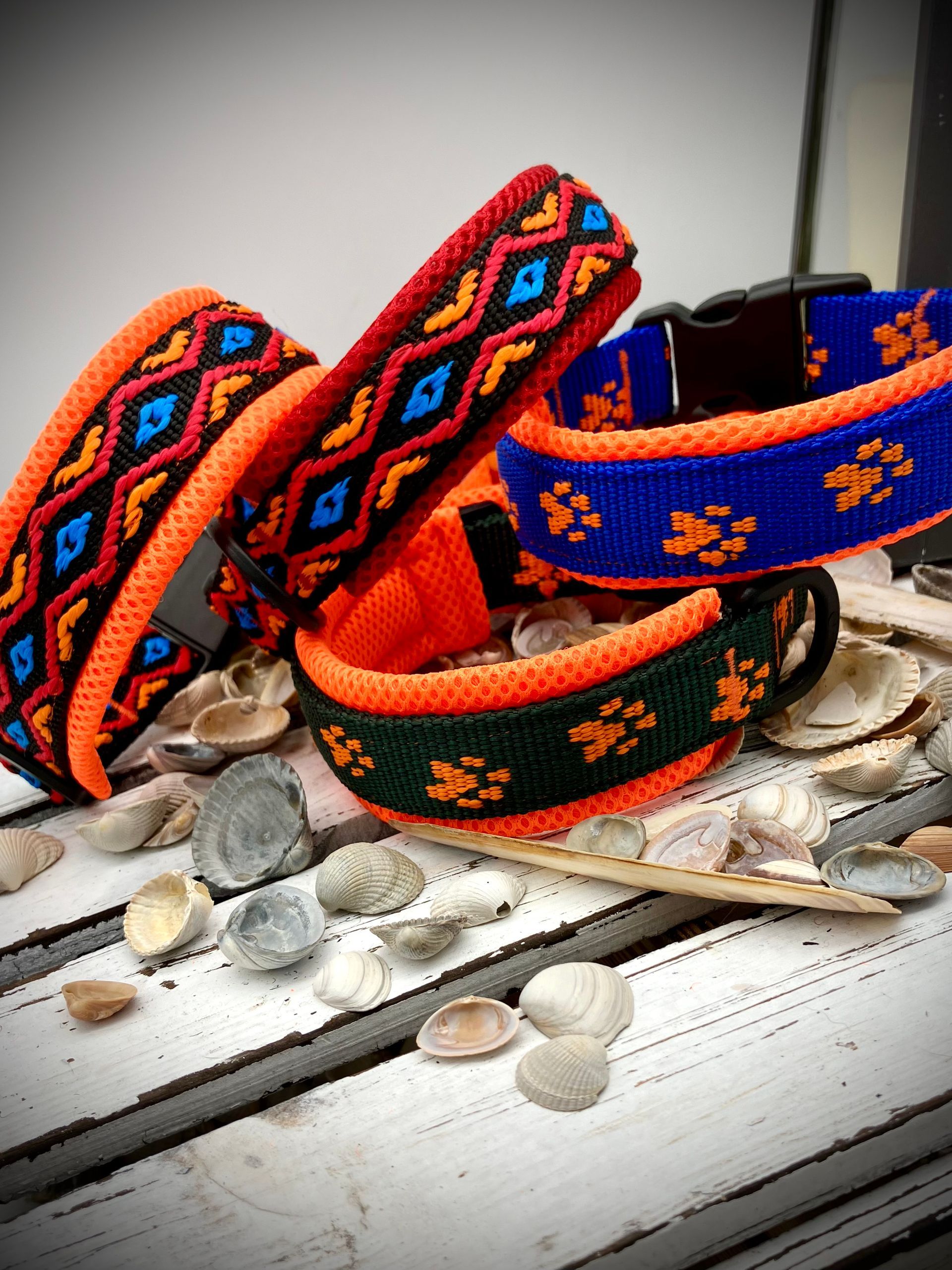 Meine handgefertigten Produkte sind alle maßangepasst und können in beinah unendlicher Vielfalt nach Eurem Wunsch angefertigt werden. Dafür müssen Hund und Besitzer nicht physisch präsent sein - über wenige, einfach zu ermittelnde Messwerte wird die Basis für ein perfekt sitzendes Halsband oder Geschirr übermittelt. Die Auswahl an Farben und Beschlägen richtet sich nach Euren Wünschen und wird innerhalb kürzester Zeit in wenigen Beratungsgesprächen finalisiert.