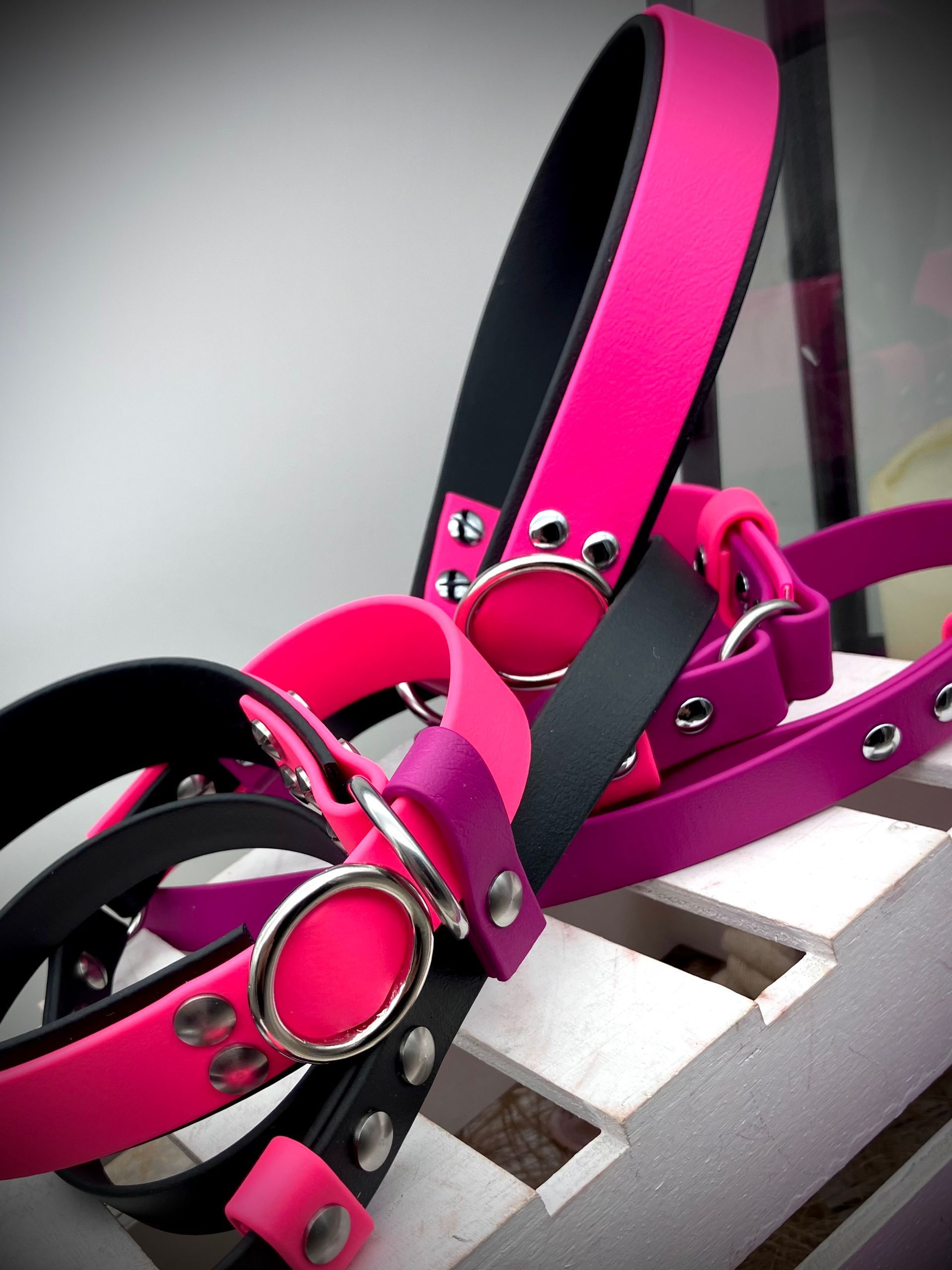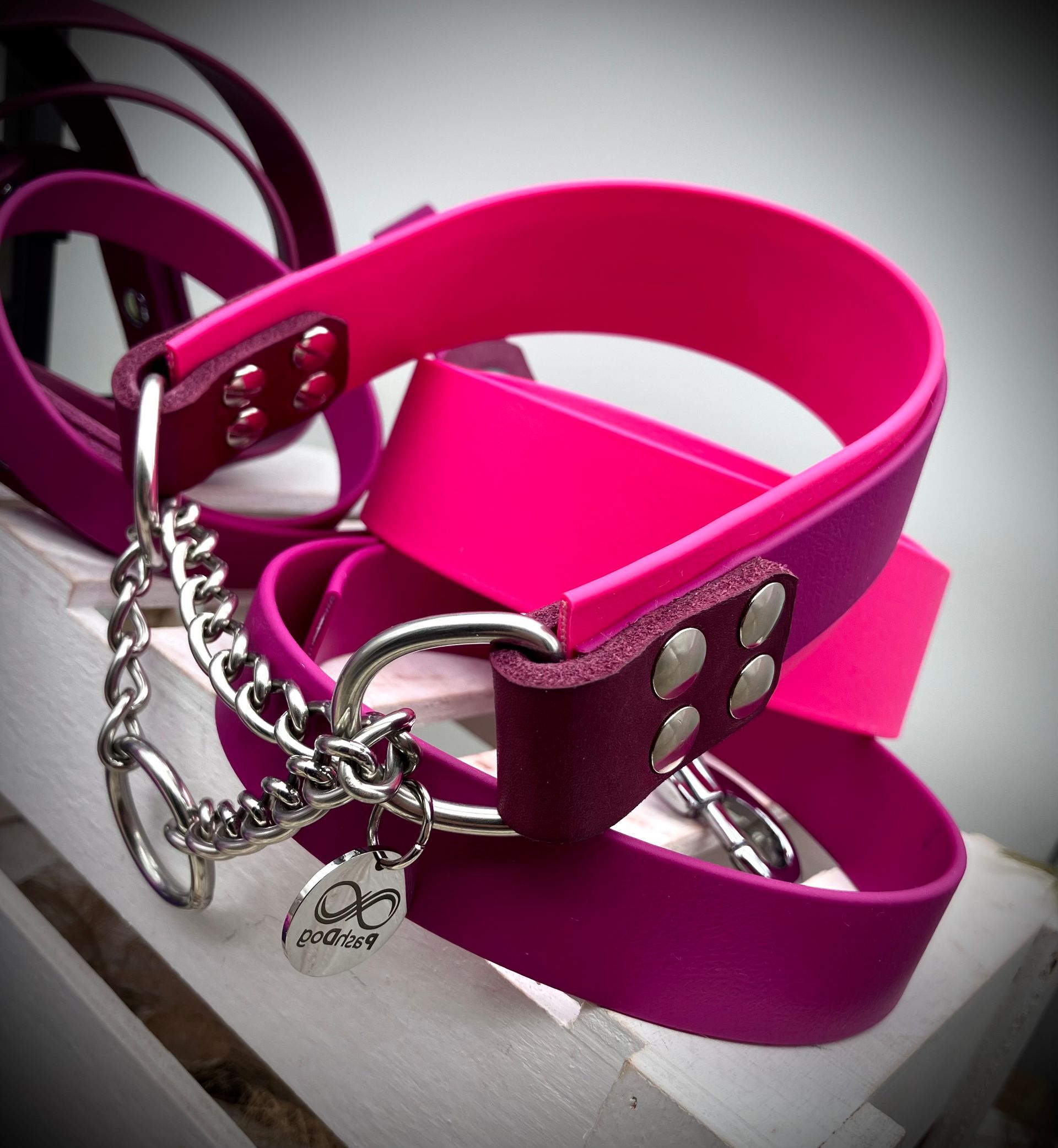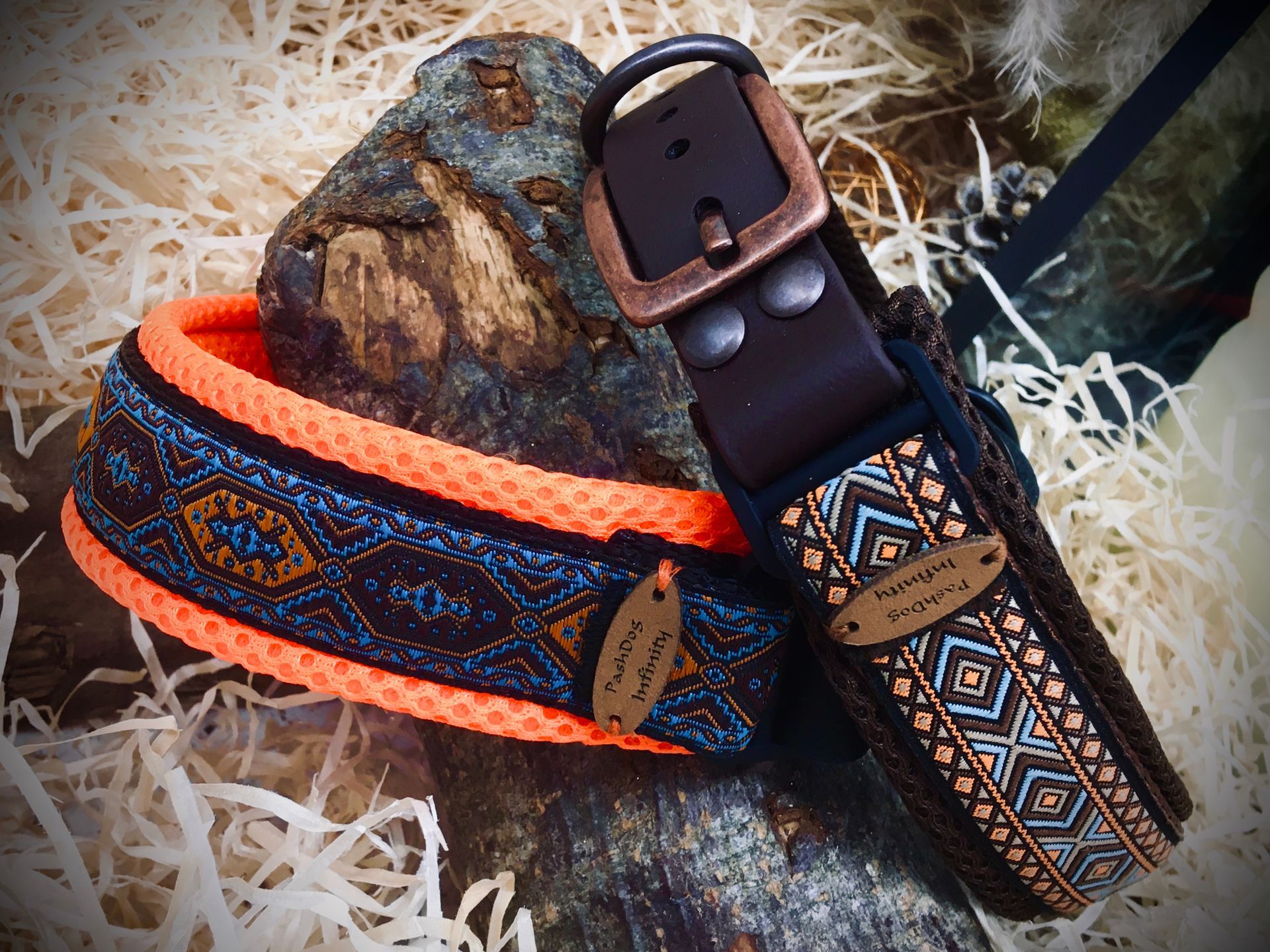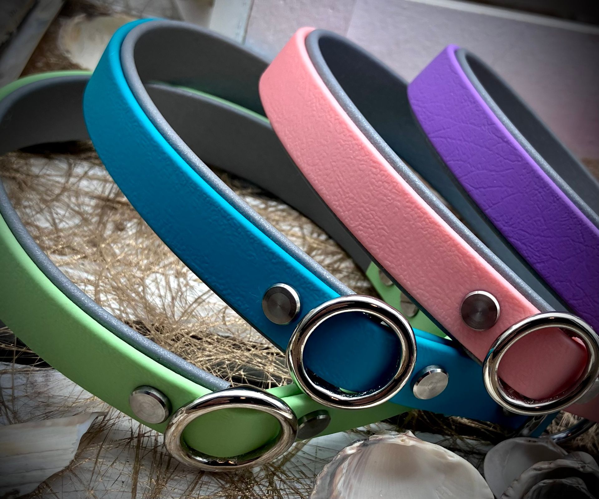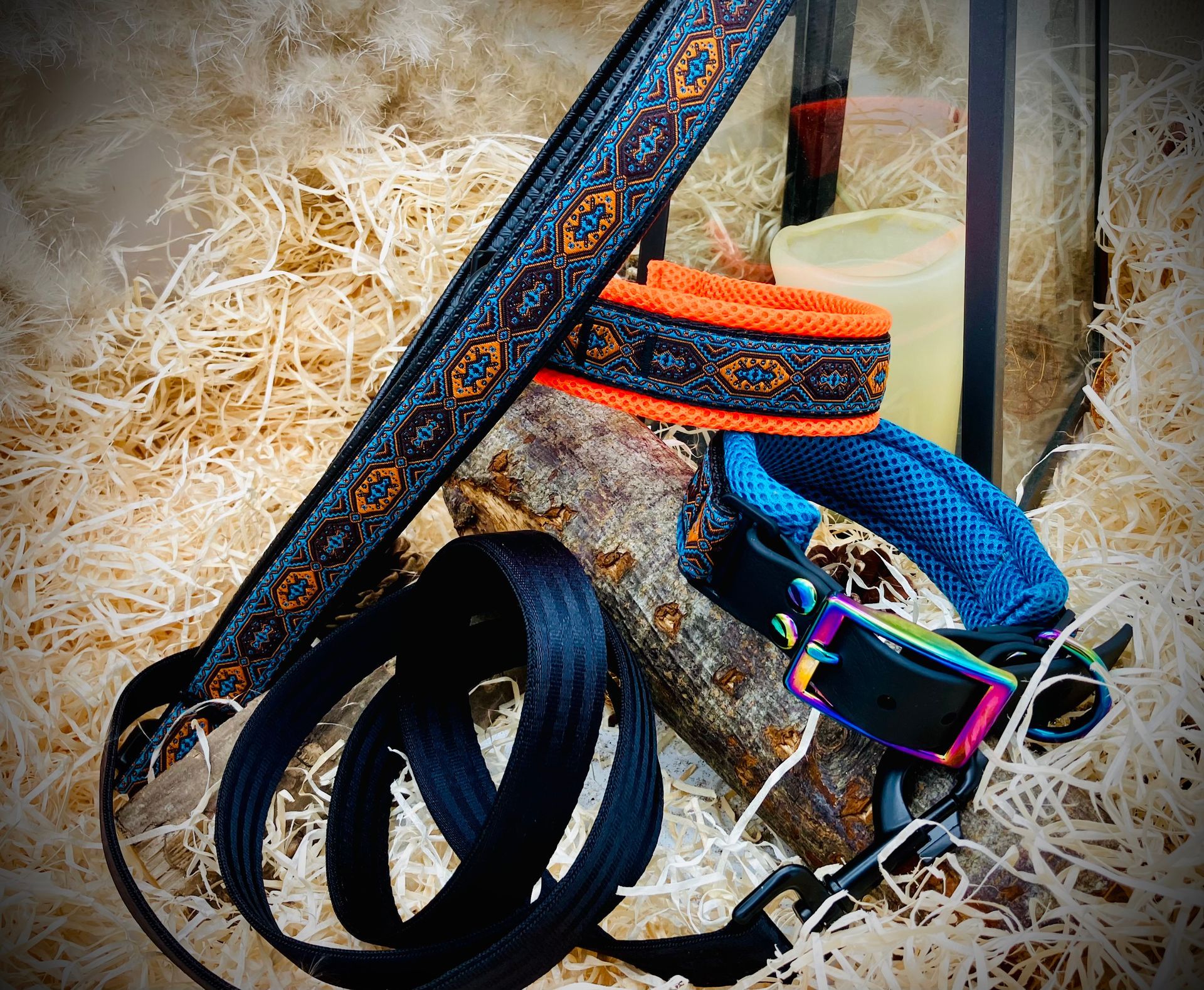 Meine handgefertigten Produkte sind alle maßangepasst und können in beinah unendlicher Vielfalt nach Eurem Wunsch angefertigt werden. Dafür müssen Hund und Besitzer nicht physisch präsent sein - über wenige, einfach zu ermittelnde Messwerte wird die Basis für ein perfekt sitzendes Halsband oder Geschirr übermittelt. Die Auswahl an Farben und Beschlägen richtet sich nach Euren Wünschen und wird innerhalb kürzester Zeit in wenigen Beratungsgesprächen finalisiert.